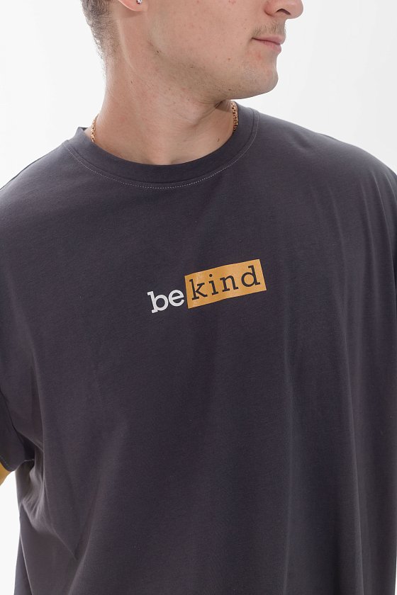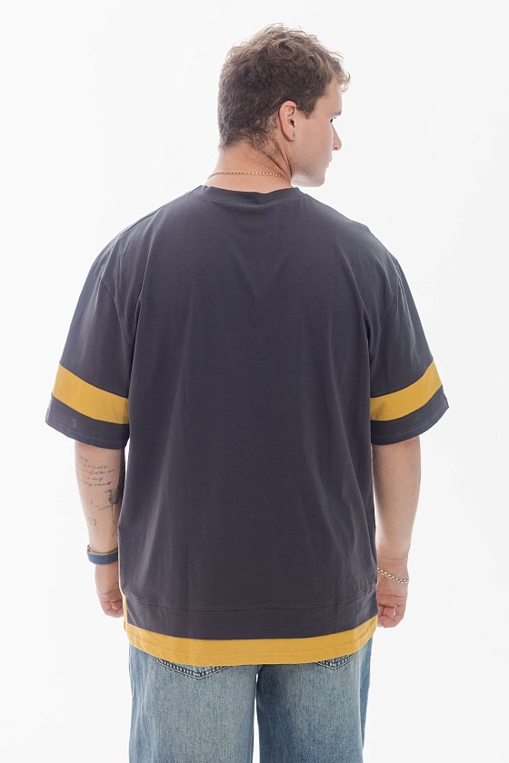 Футболка мужская в лёгком оверсайз-силуэте выполнена из однотонной кулирки с контрастной отделкой. Рукава длиной до локтя украшены вставками из отделочного полотна. По низу изделия также расположена фигурная отделочная деталь. На полочке — стильный принт, придающий футболке современный акцент.