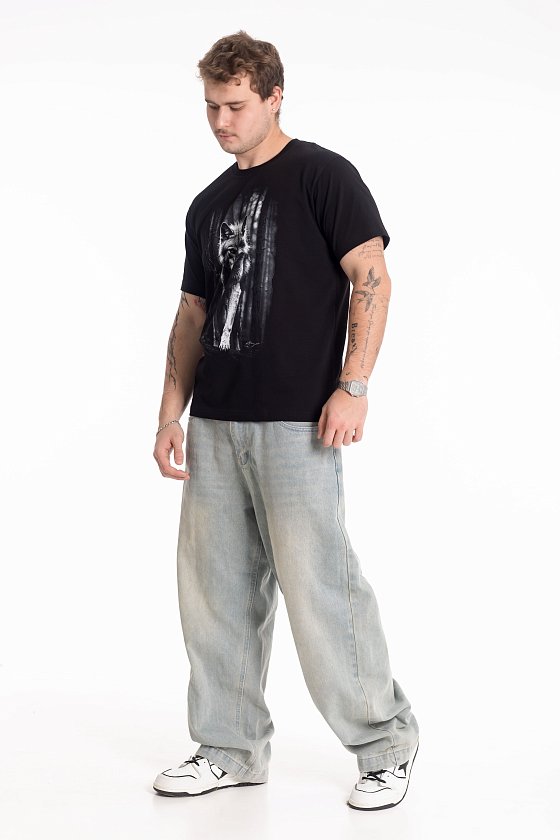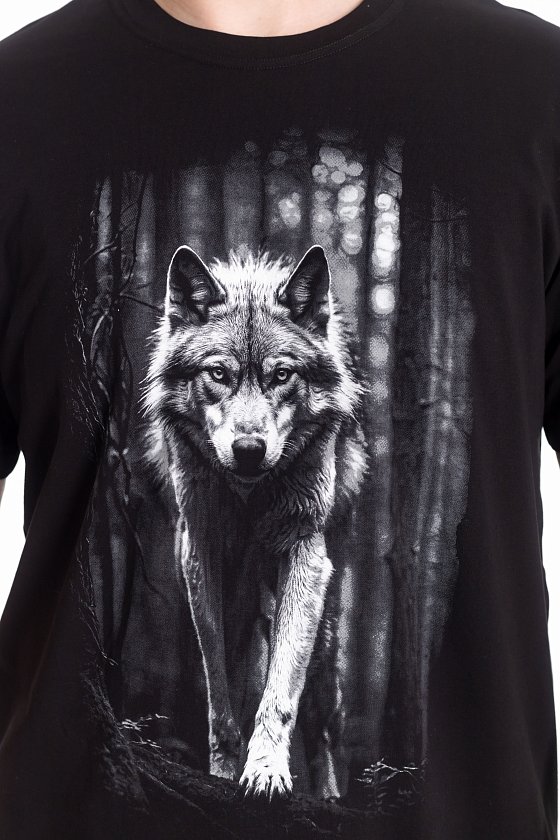 Футболка из хлопкового полотна с лайкрой — удобная и практичная модель для повседневной носки. Изделие с коротким рукавом и круглым вырезом горловины, аккуратно обработанным планкой. Спереди расположен стильный принт с изображением волка, придающий образу выразительность и динамику.