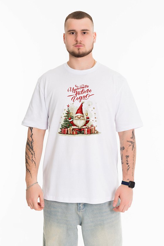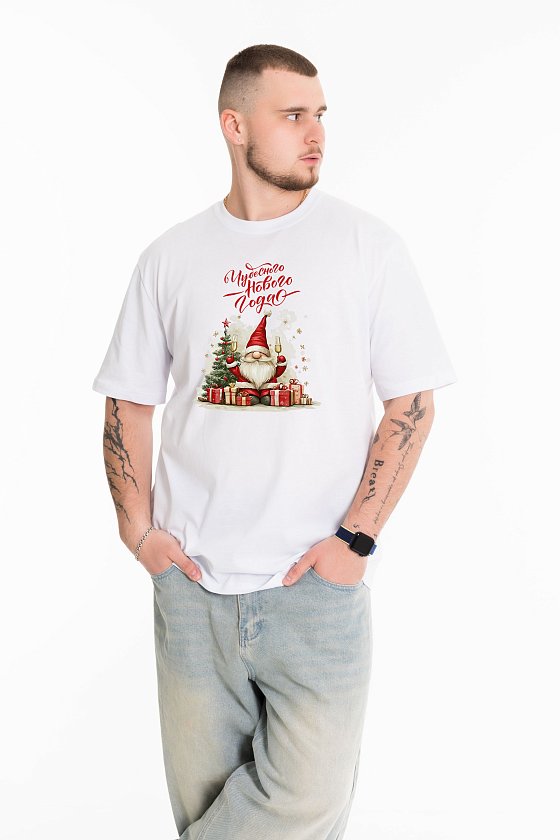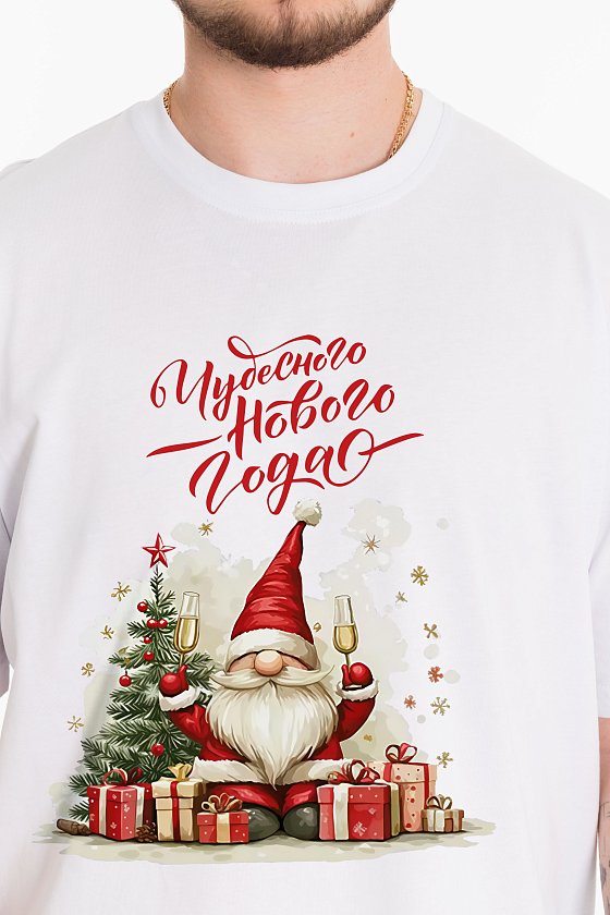 Футболка с новогодним принтом выполнена из хлопкового полотна. Материал приятен к телу, создает комфорт и хорошую воздухопроницаемость. Классический крой с коротким рукавом и круглым вырезом горловины обеспечивает удобную посадку и свободу движений. Отличный выбор для создания праздничного настроения и комфортных повседневных образов.