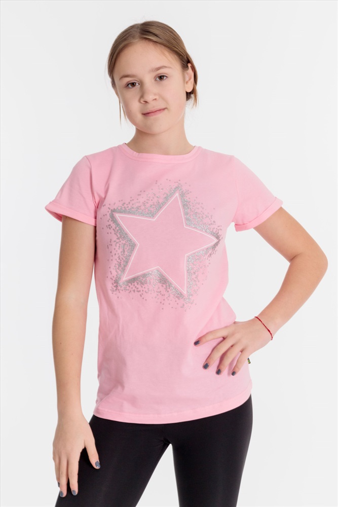 Цвет Номенклатуры: розовый Футболка с принтом спереди выполнена из однотонной кулирки. Горловина округлая, обработана притачной планкой. Рукав короткий, втачной, с отложной манжетой.