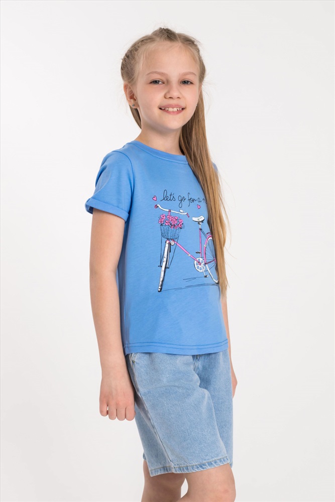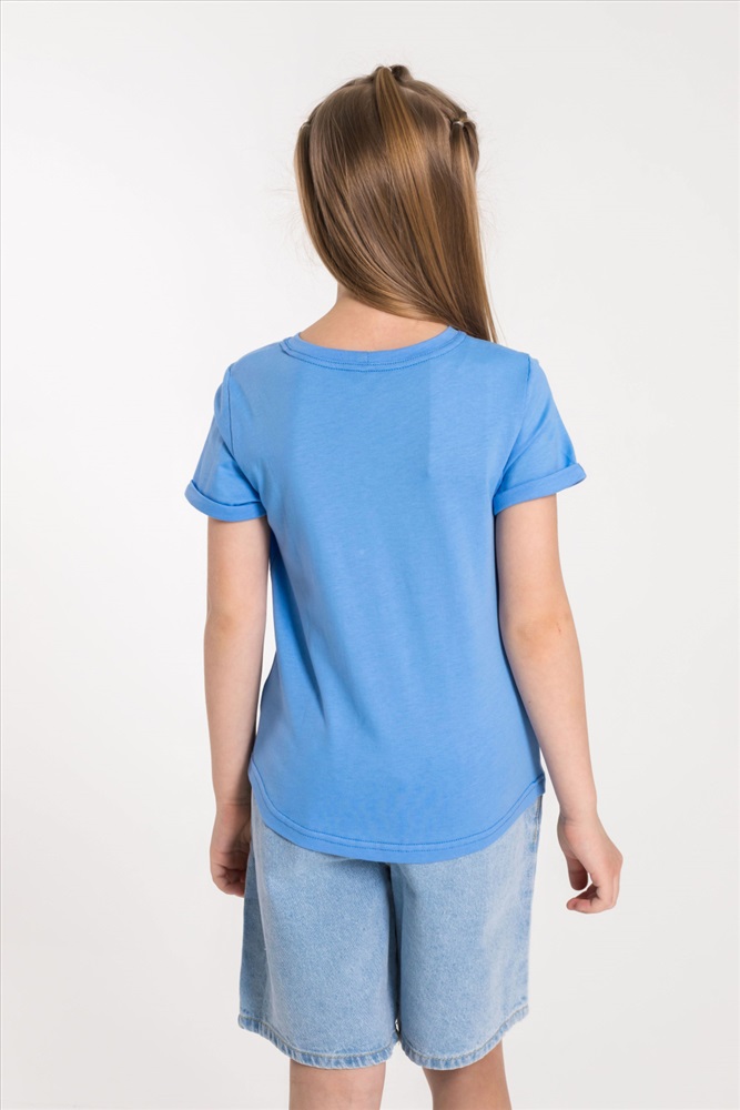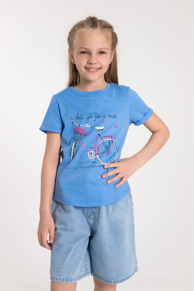Футболка для девочки выполнена из кулирки, 100% хлопок. С коротким втачным рукавом с отложной манжетой, со скругленным разноуровневым низом и красивым принтом спереди. Горловина округлая, обработана планкой.