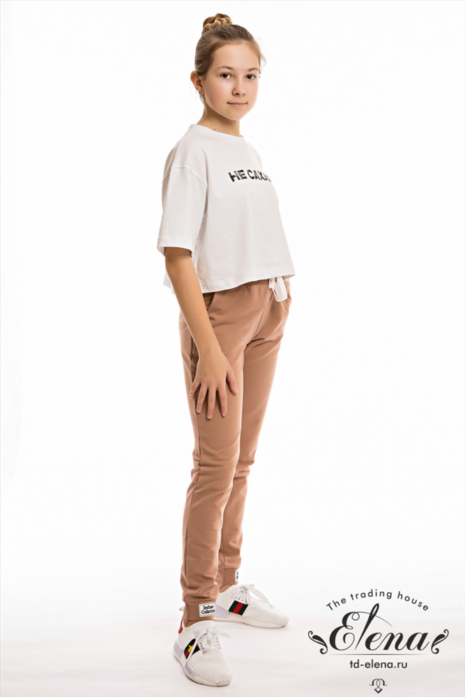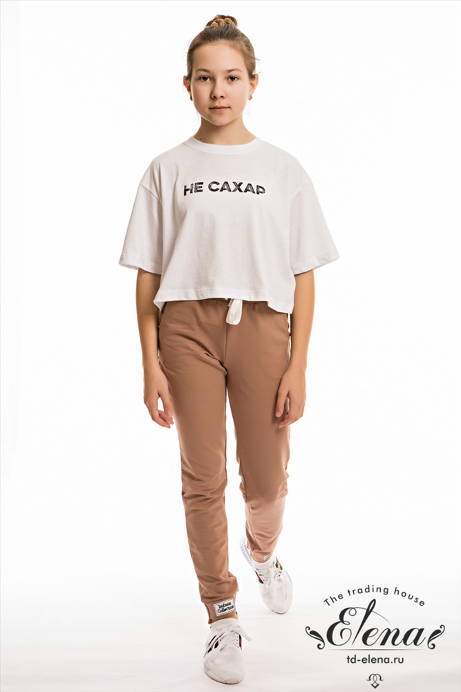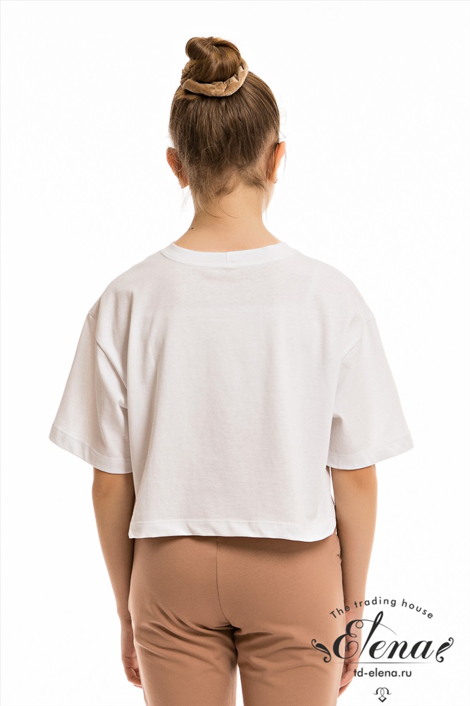 Сезон: Всесезонный Силуэт: Свободный Состав: Хлопок 100% Цвет Номенклатуры: белый Модная футболка для девочек выполнена из однотонной кулирки. Футболка короткая, свободная, со спущенной линией плеча и рукавом длиной до локтя. Спереди нанесён принт. Комментарии к товару