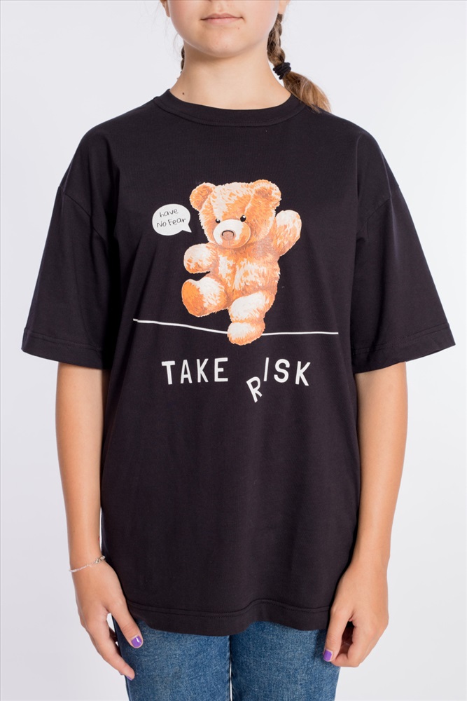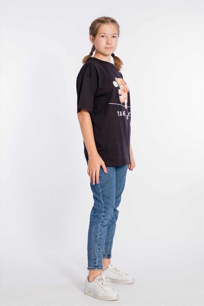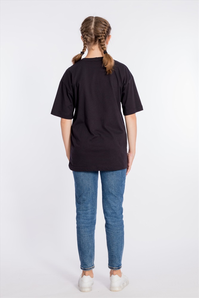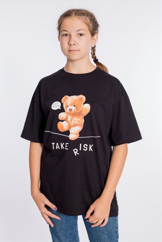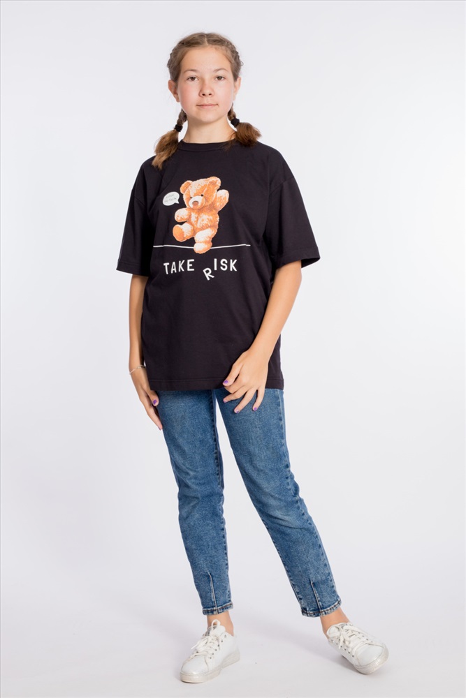 Футболка оверсайз из однотонной кулирки, 100% хлопок. С коротким рукавом и круглым вырезом горловины. Спереди нанесён принт.