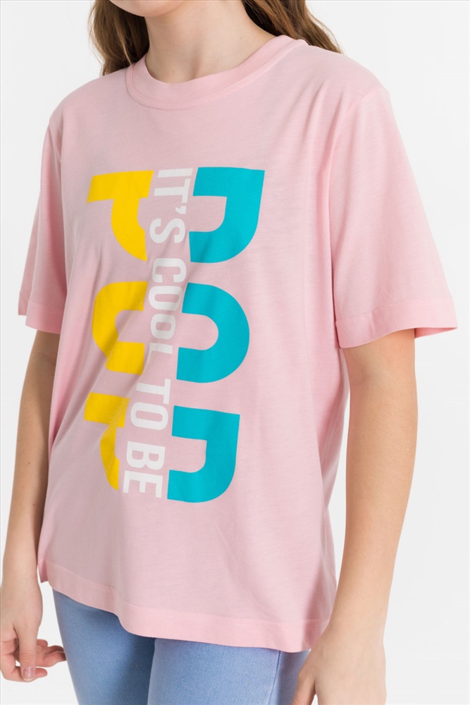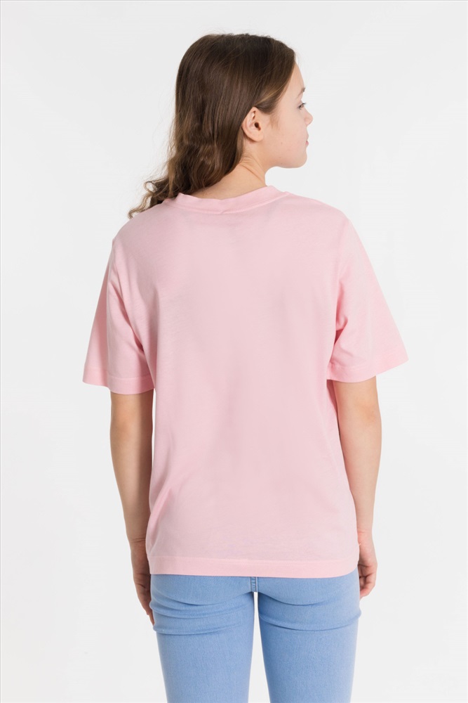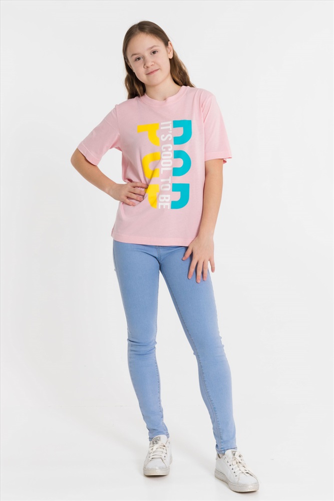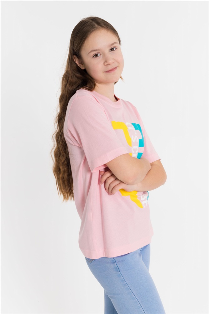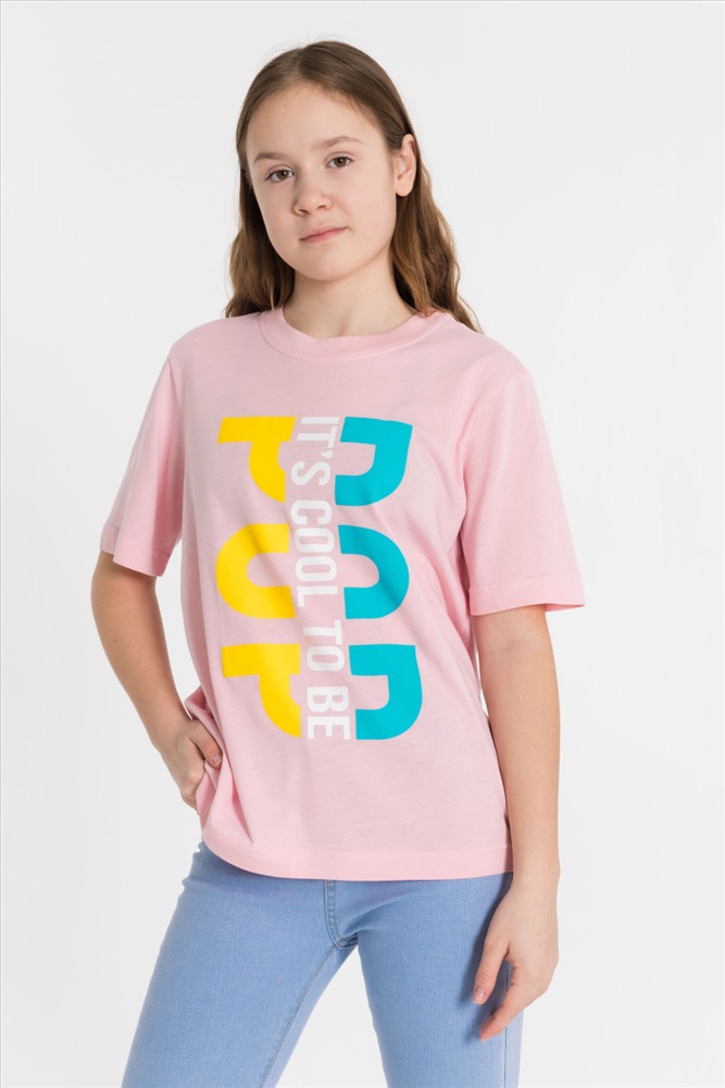 Сезон: Всесезонный Силуэт: Свободный Состав: Хлопок 100% Цвет Номенклатуры: пудровый Футболка из однотонной кулирки. Круглый вырез горловины, втачной рукав, на полочке принт Комментарии к товару