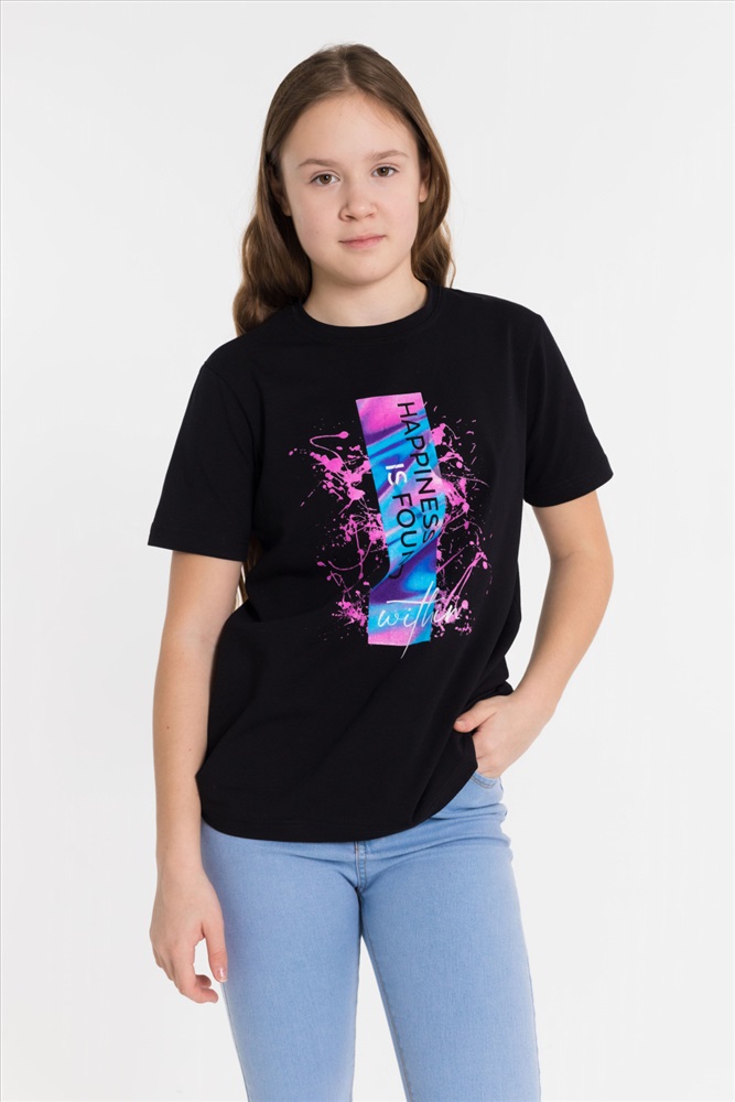 Сезон: Всесезонный Силуэт: Прямой Состав: Хлопок 95% Лайкра 5% Цвет Номенклатуры: черный Футболка из однотонной кулирки с лайкрой. Круглый вырез горловины, втачной рукав, на полочке принт. Размерный ряд: 28/98-42/164 Комментарии к товару
