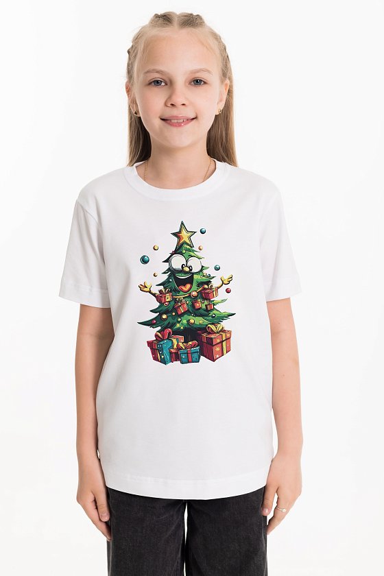 Футболка с новогодним принтом выполнена из хлопкового полотна с добавлением лайкры. Материал приятен к телу, создает комфорт и хорошую воздухопроницаемость. Классический крой с коротким рукавом и круглым вырезом горловины обеспечивает удобную посадку и свободу движений. Отличный выбор для создания праздничного настроения и комфортных повседневных образов.