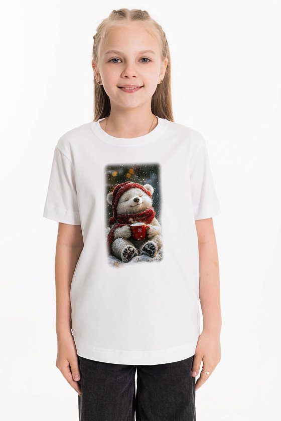 Футболка с новогодним принтом выполнена из хлопкового полотна с добавлением лайкры. Материал приятен к телу, создает комфорт и хорошую воздухопроницаемость. Классический крой с коротким рукавом и круглым вырезом горловины обеспечивает удобную посадку и свободу движений. Отличный выбор для создания праздничного настроения и комфортных повседневных образов.