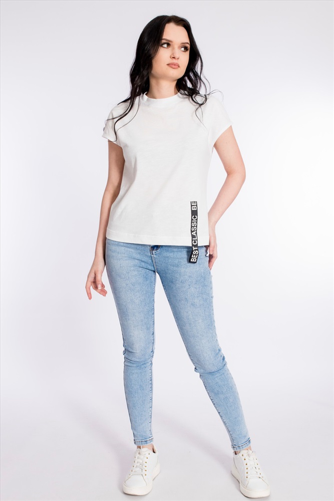 Сезон: Всесезонный Силуэт: Свободный Состав: Хлопок 100% Цвет Номенклатуры: белый Футболка выполнена из х/б полотна фламли. Линия плеча спущена, горловина оформлена притачной планкой. Спереди, в нижнем левом углу настрочена декоративная лента с надписью. Комментарии к товару