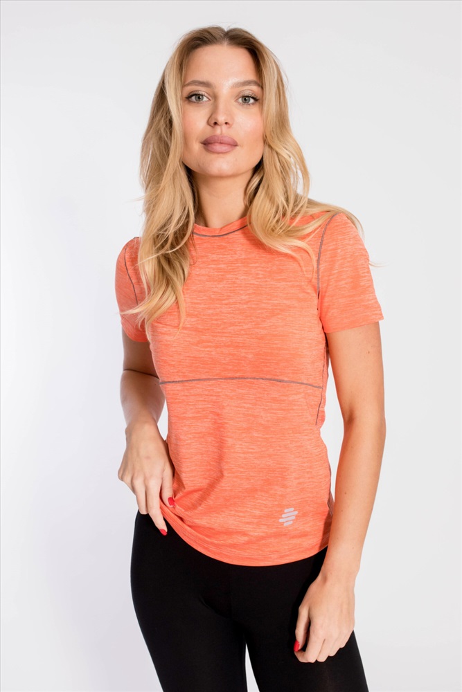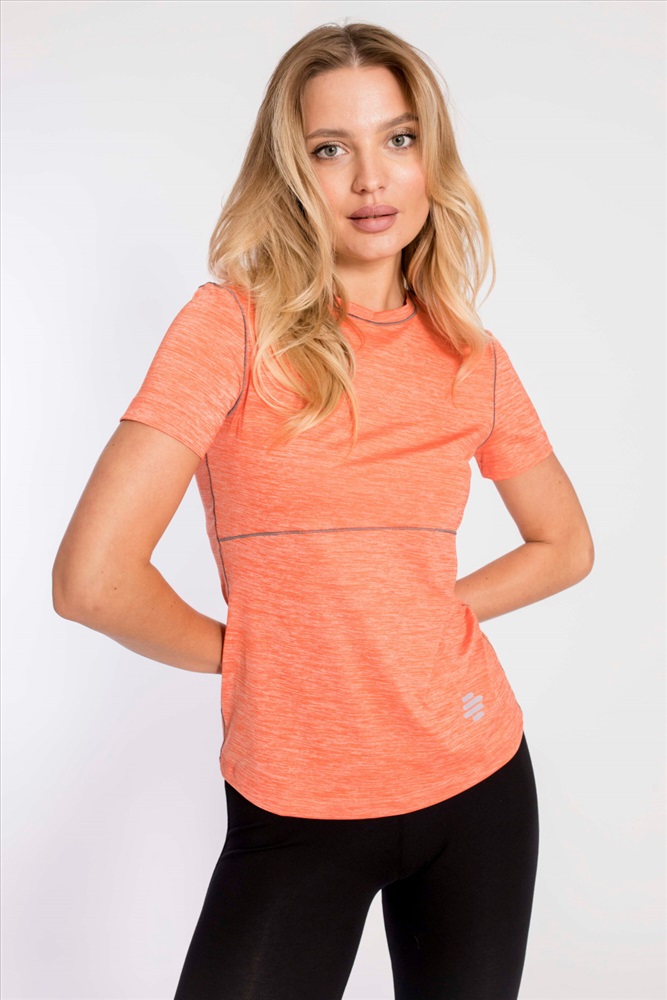 Сезон: Всесезонный Силуэт: Приталенный Состав: Полиэстер 100% Цвет Номенклатуры: оранжевый Футболка выполнена из бифлекса. Вырез горловины круглый, рукава короткие. Футболка собрана декоративной строчкой, нитками в цвет термопринта спереди. Комментарии к товару