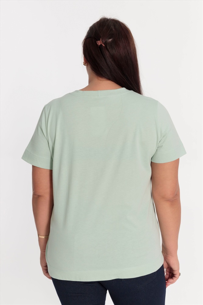 Футболка из однотонной кулирки, 100% хлопок. С коротким втачным рукавом и притачной планкой по горловине. Спереди нанесён принт.
