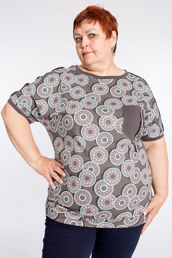Футболка выполнена из х/б полотна с набивным рисунком. Силуэт свободный, вырез горловины округлый. Спереди размещён нагрудный карман.