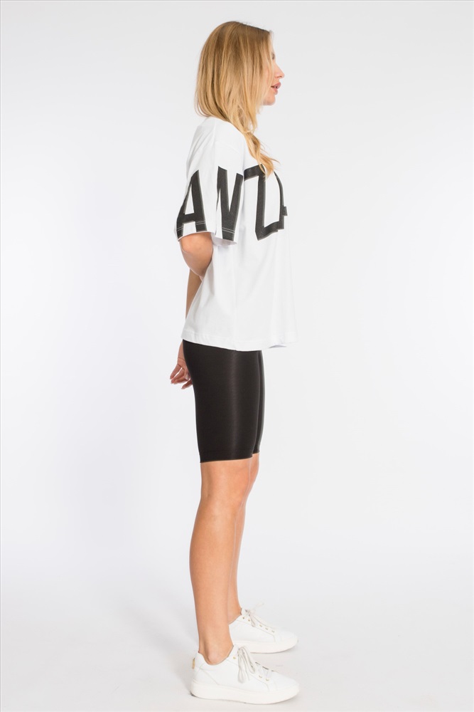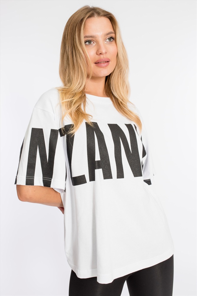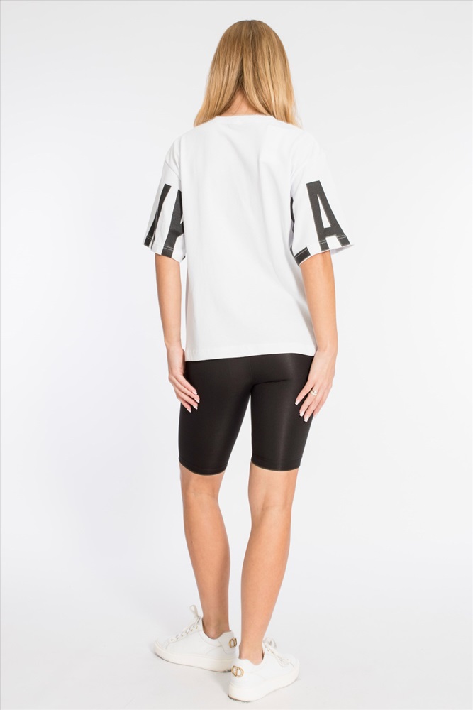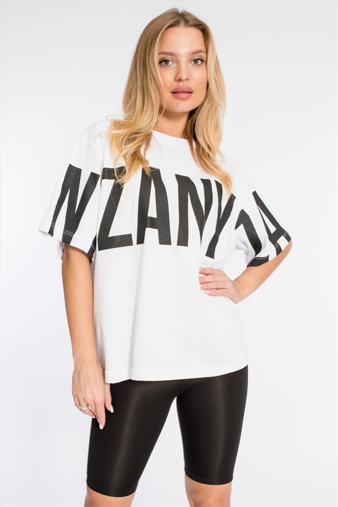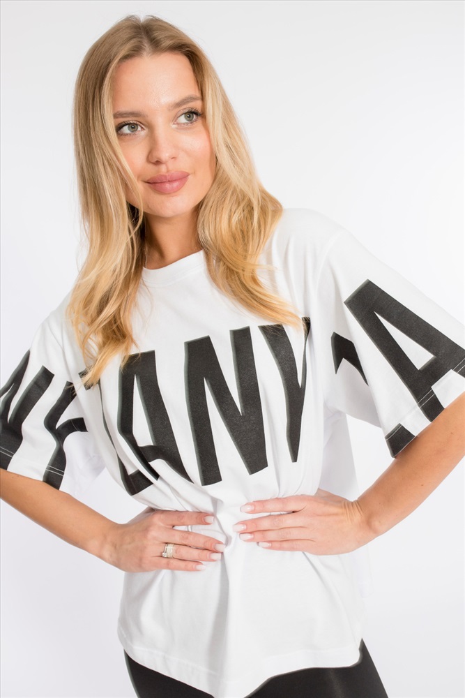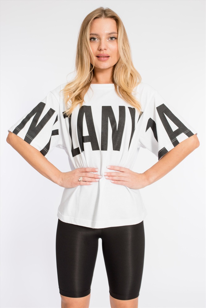 Цвет Номенклатуры: белый Футболка свободного силуэта выполнена из х/б полотна. Вырез горловины круглый. Спереди и на рукавах нанесён принт.