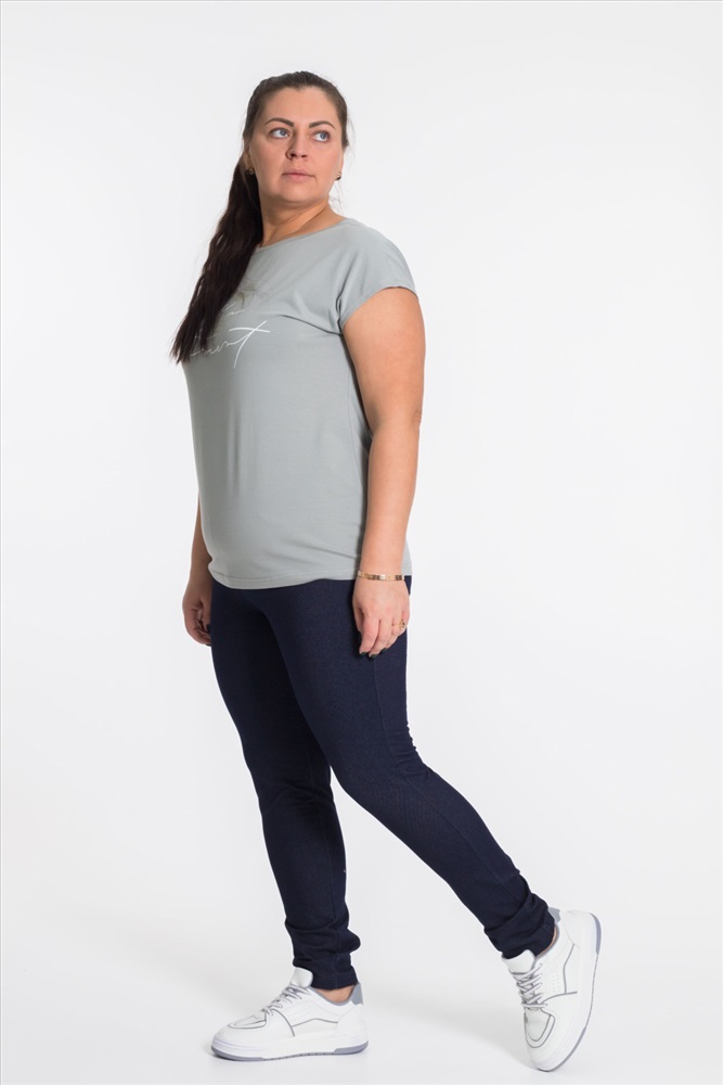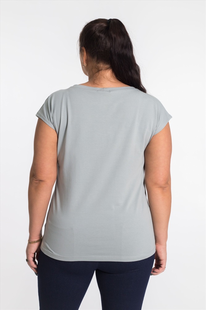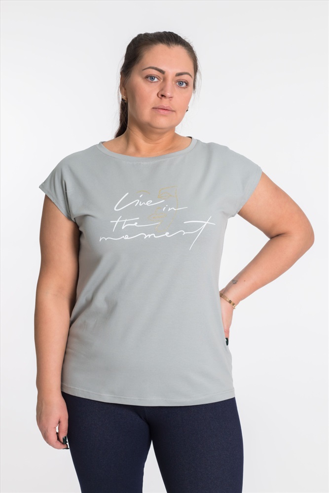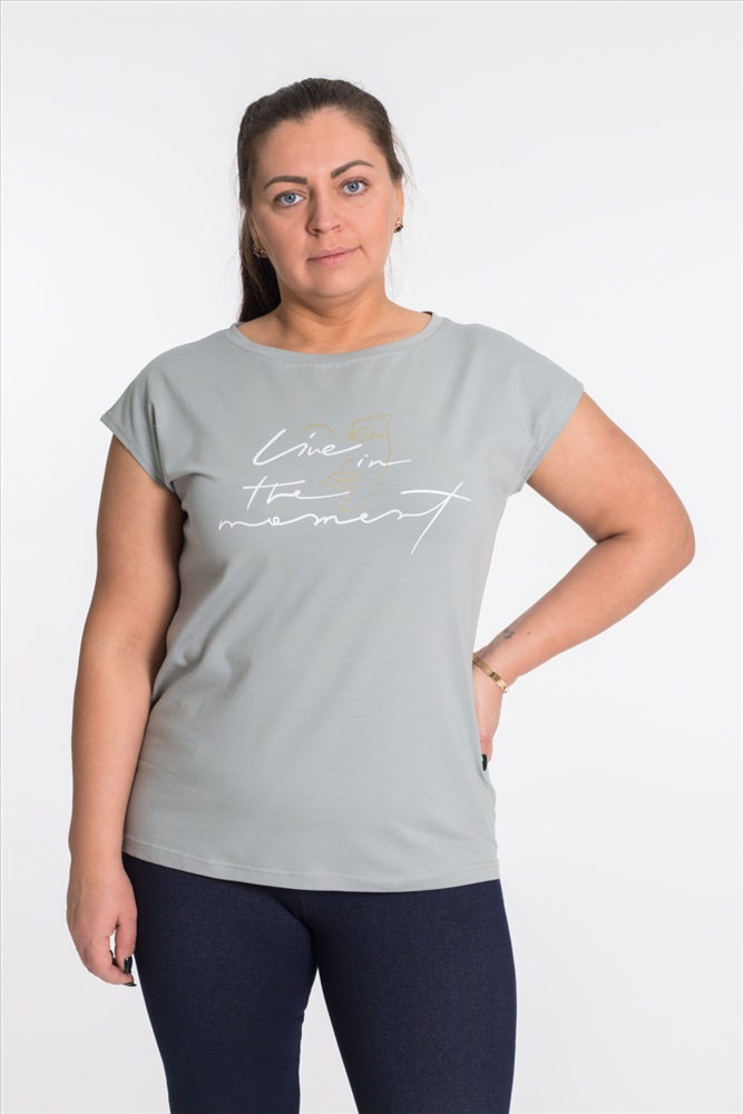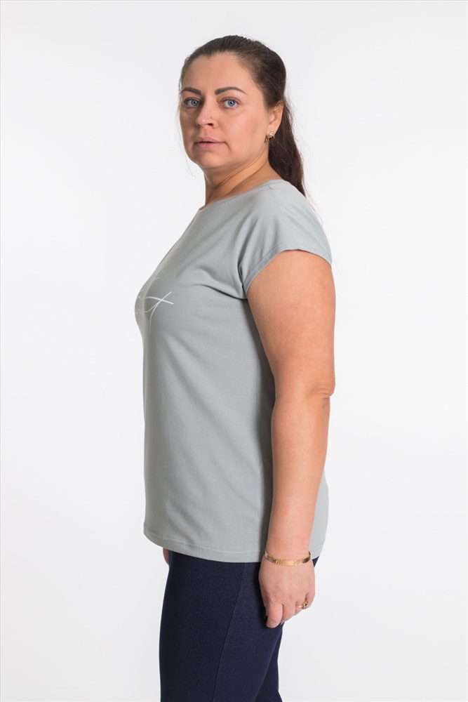 Сезон: Всесезонный Силуэт: Приталенный Состав: Хлопок 95% Лайкра 5% Цвет Номенклатуры: серый Футболка из однотонной кулирки. Спущенное плечо, вырез горловины "лодочка", на полочке принт. Комментарии к товару