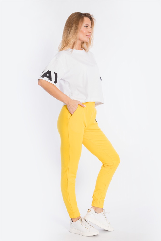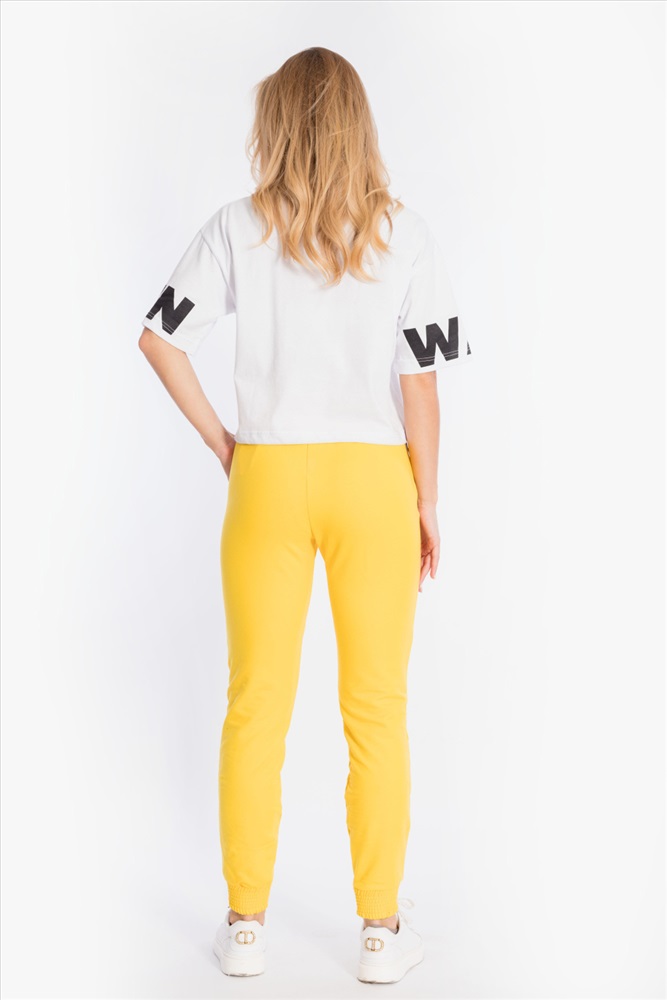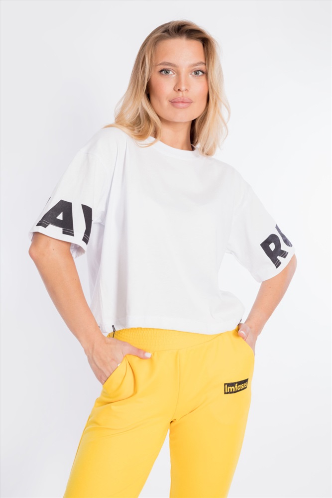 Сезон: Всесезонный Силуэт: Oversize Состав: Хлопок 100% Цвет Номенклатуры: белый Футболка укороченная, оверсайз силуэта, выполнена из однотонной кулирки. С коротким рукавом и круглым вырезом горловины. По низу вставлен узкий шнур с фиксаторами. На рукавах нанесён принт. Комментарии к товару