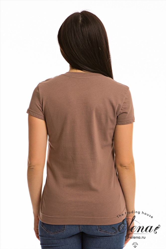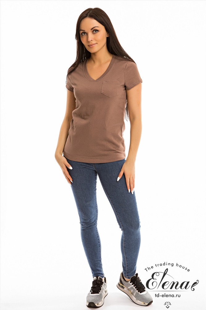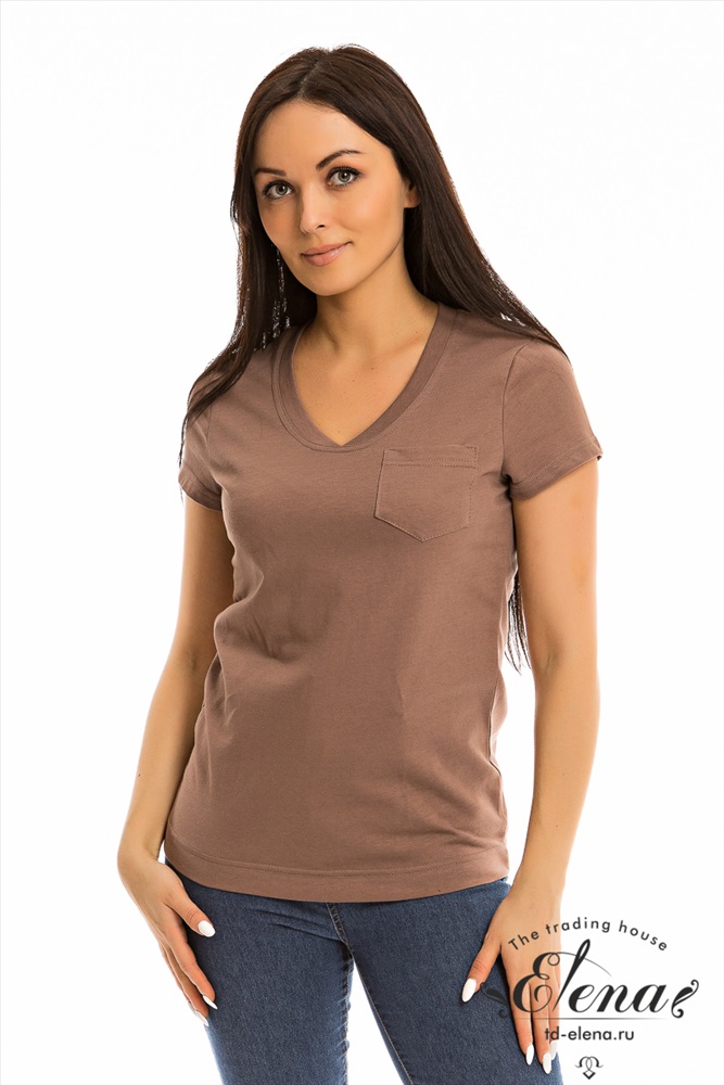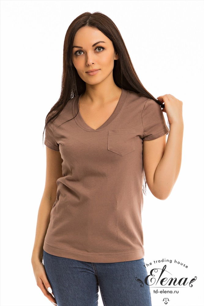 Футболка женская выполнена из кулирки. Силуэт полуприлегающий, вырез горловины V-образный, рукав короткий. Слева настрочен карман.