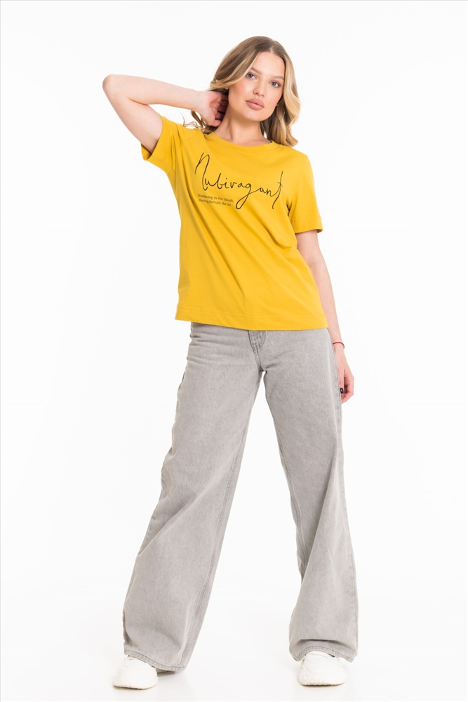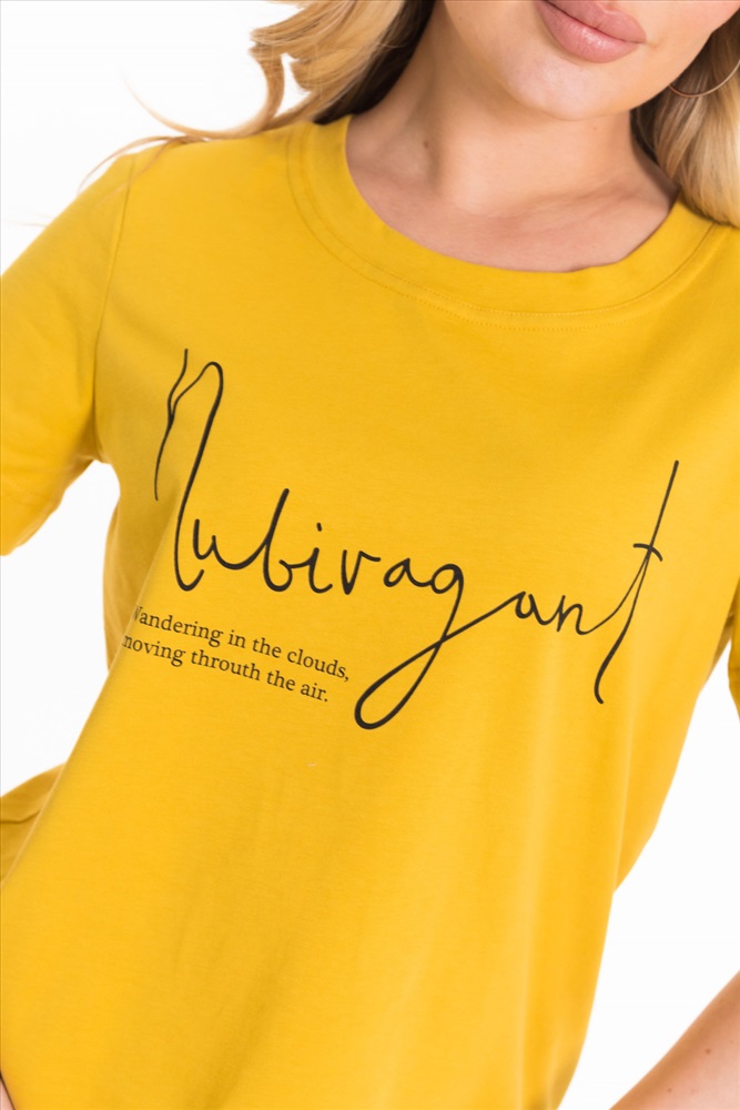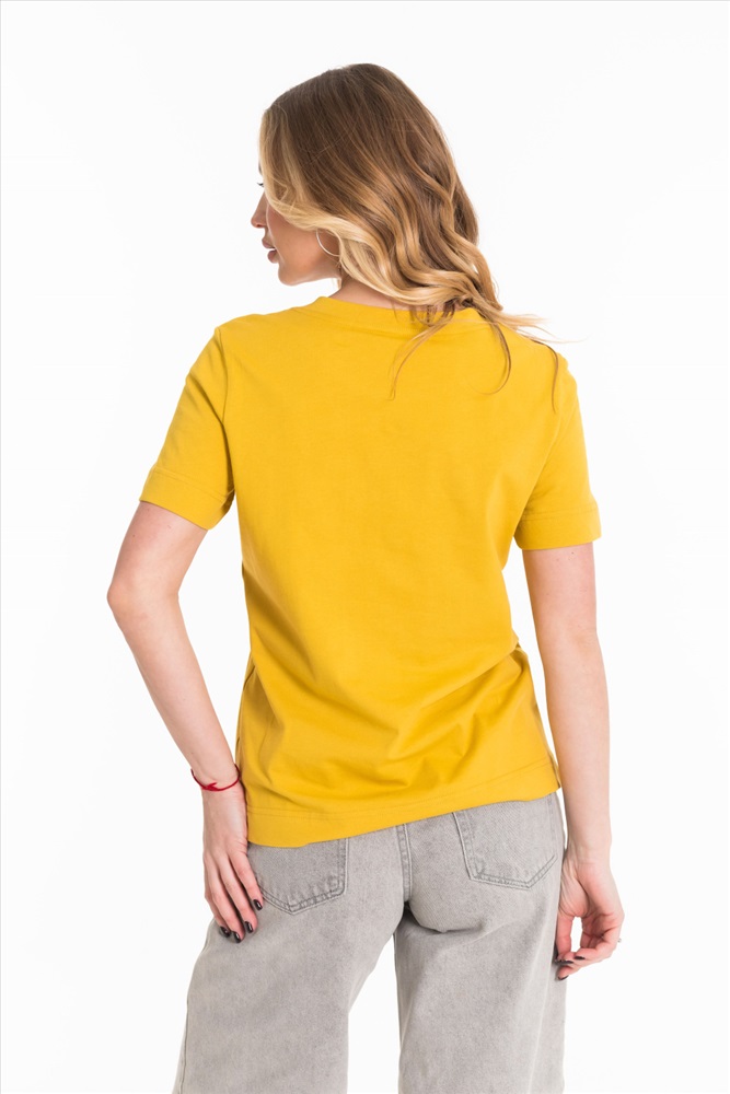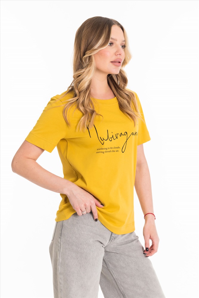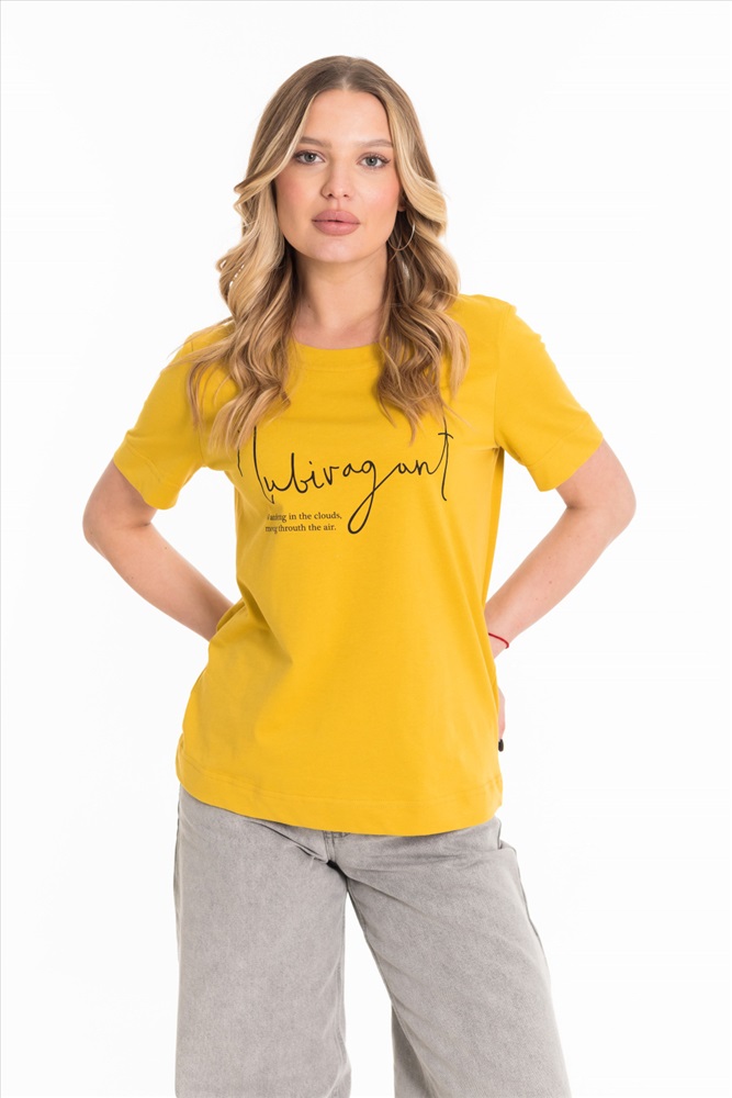 Цвет Номенклатуры: горчичный Футболка из однотонной кулирки, 100% хлопок. С коротким втачным рукавом и притачной планкой по круглому вырезу горловины. На полочке принт.