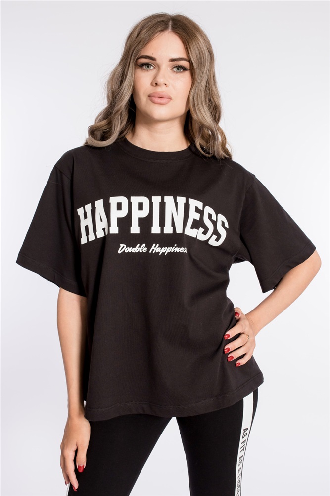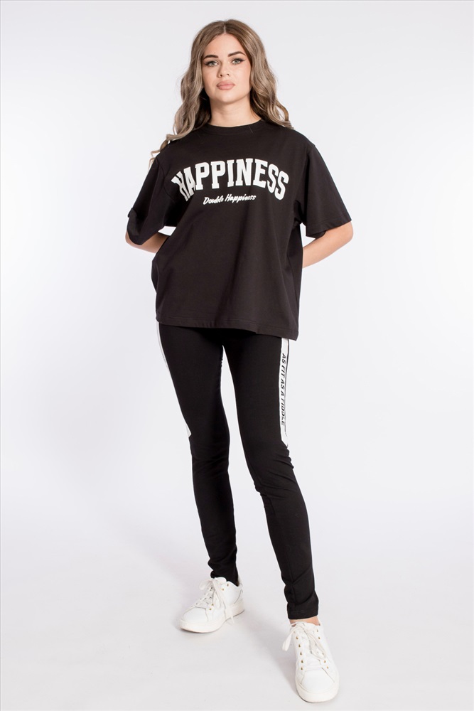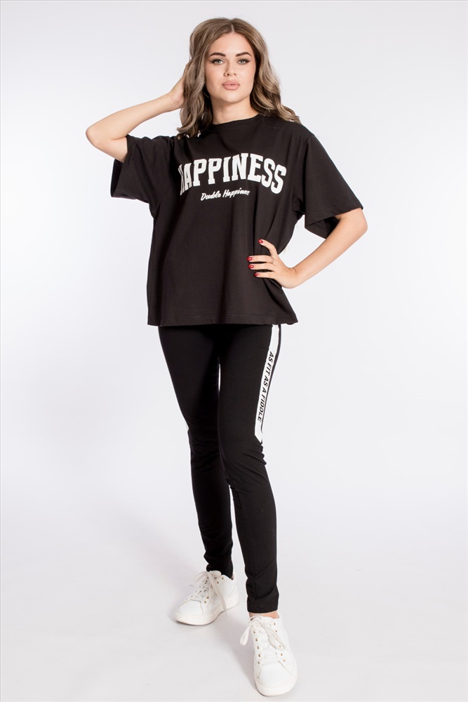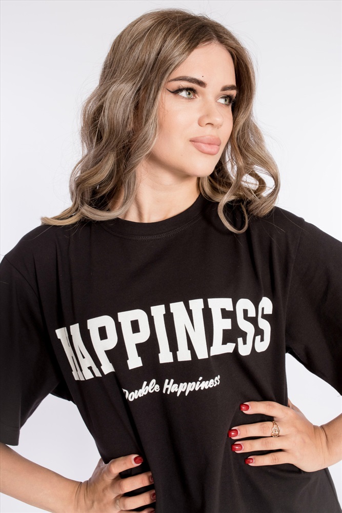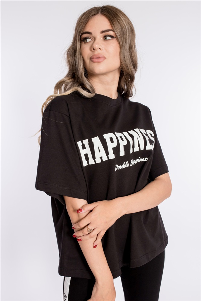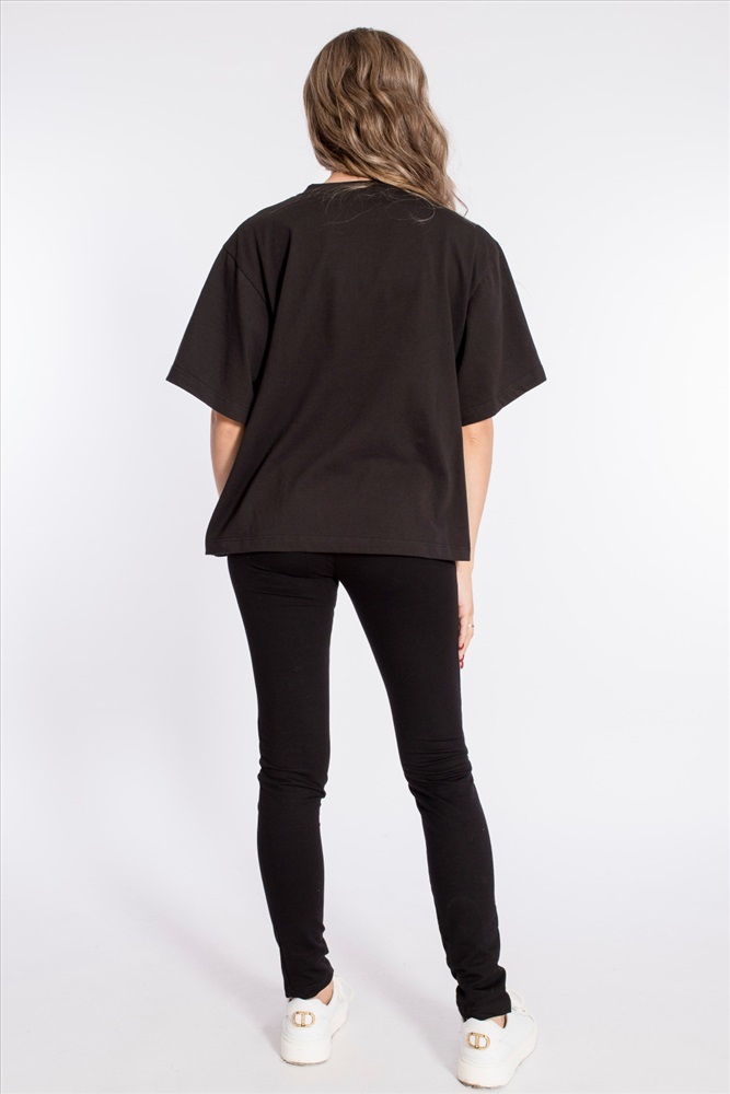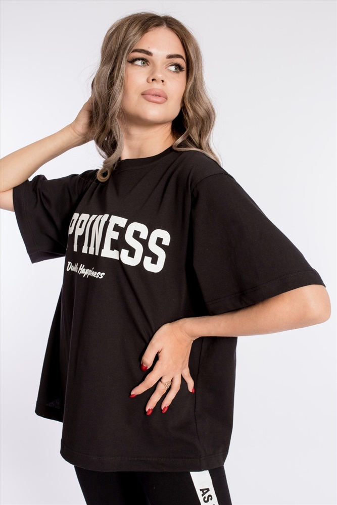Сезон: Всесезонный Силуэт: Oversize Состав: Хлопок 100% Цвет Номенклатуры: черный Футболка свободного силуэта выполнена из х/б полотна. Круглый вырез горловины оформлен планкой. Спереди нанесён принт. Комментарии к товару