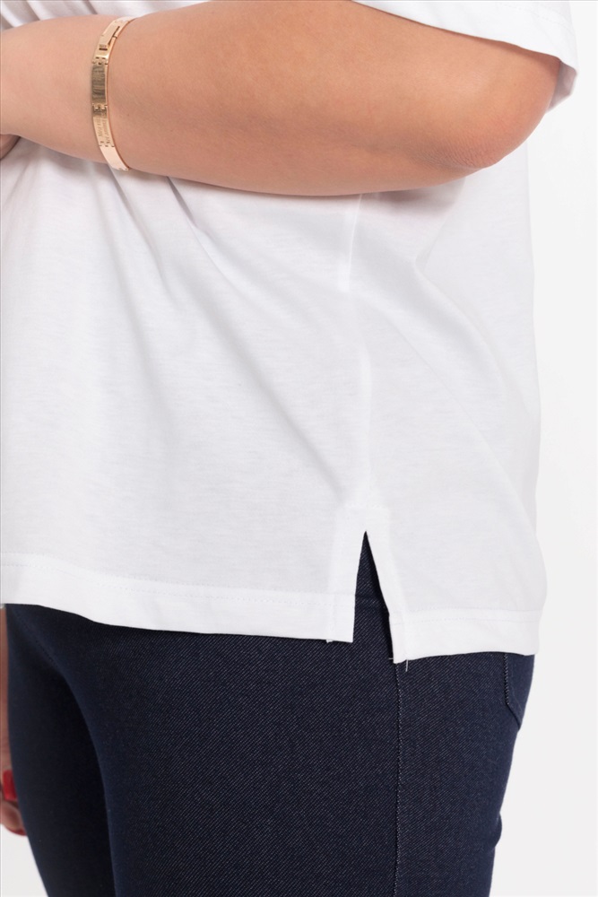 Футболка выполнена из однотонной кулирки, 100% хлопок. С коротким рукавом и круглым вырезом горловины, оформленным планкой. Внизу, в боковых швах декоративные разрезы.