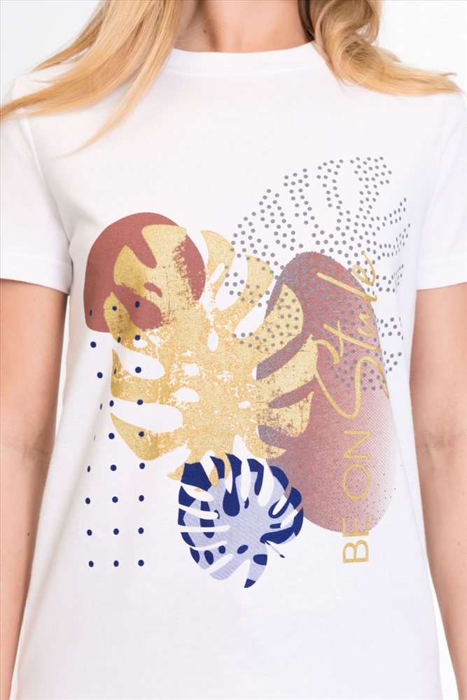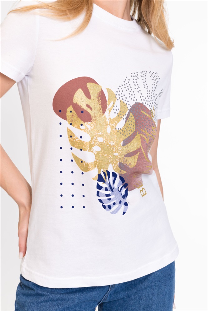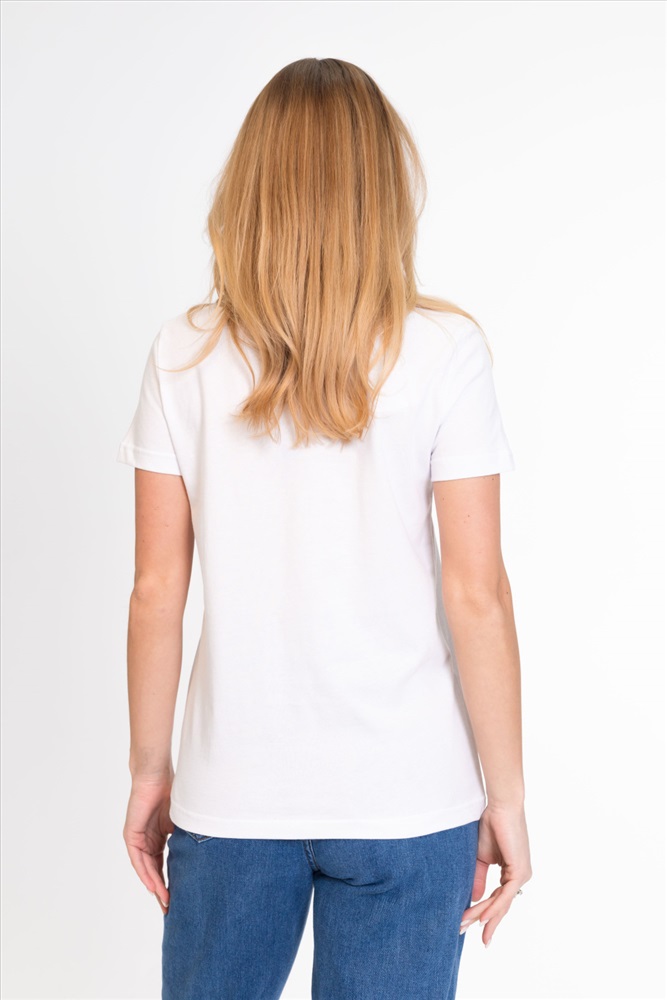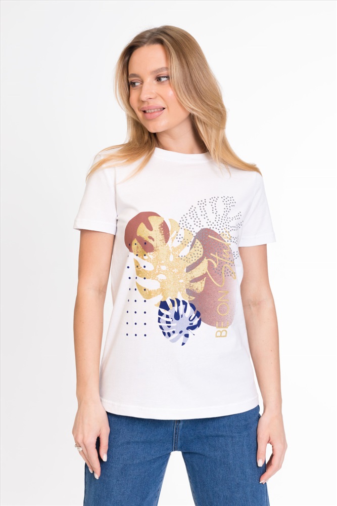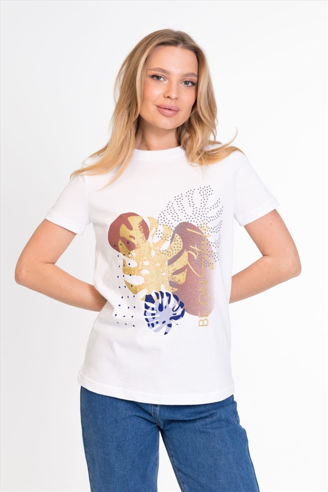 Сезон: Всесезонный Силуэт: Свободный Состав: Хлопок 100% Цвет Номенклатуры: белый Футболка из однотонной кулирки с коротким втачным рукавом. На полочке принт. Комментарии к товару