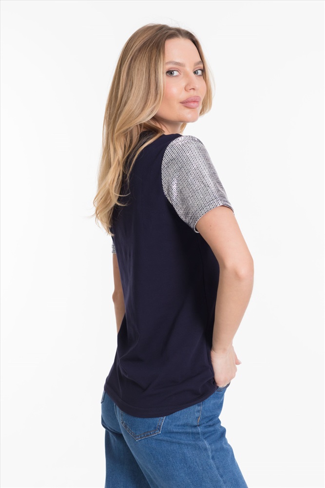 Футболка из однотонной кулирки с лайкрой и вискозы цвета серебра. Короткий втачной рукав в цвет отделочного полотна.