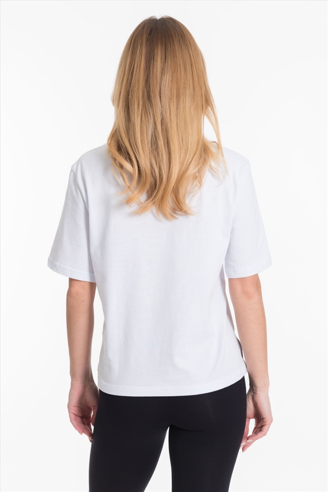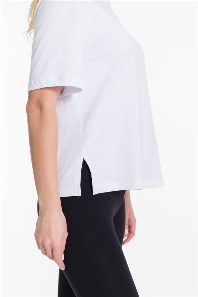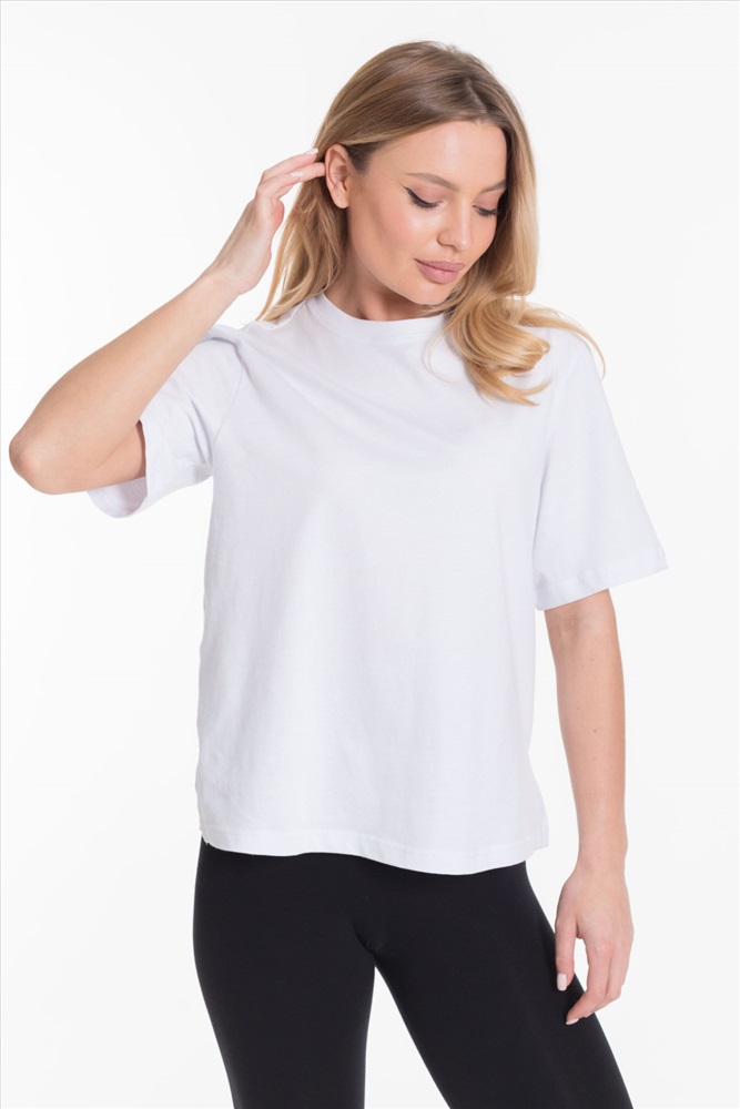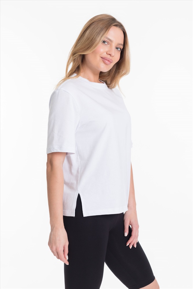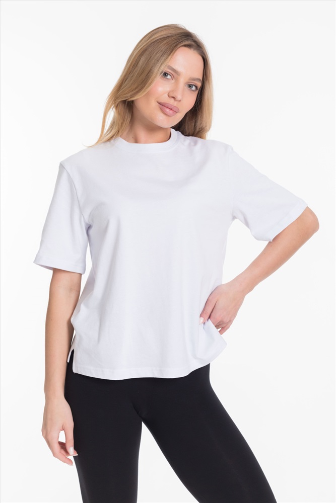 Женская футболка однотонного белого цвета выполнена из мягкого и приятного на ощупь материала - кулирка. Она имеет короткий рукав и боковые швы с разрезами, что придаёт изделию оригинальность и свободу движений.