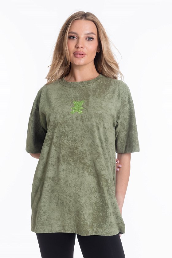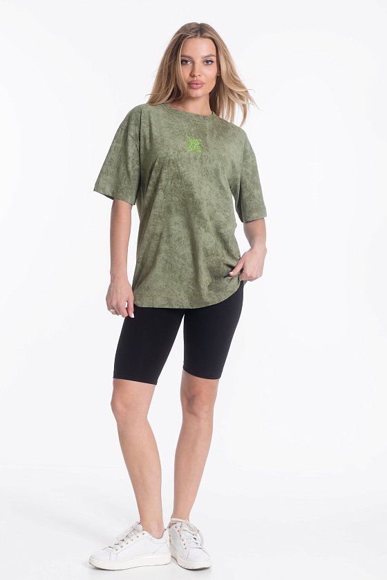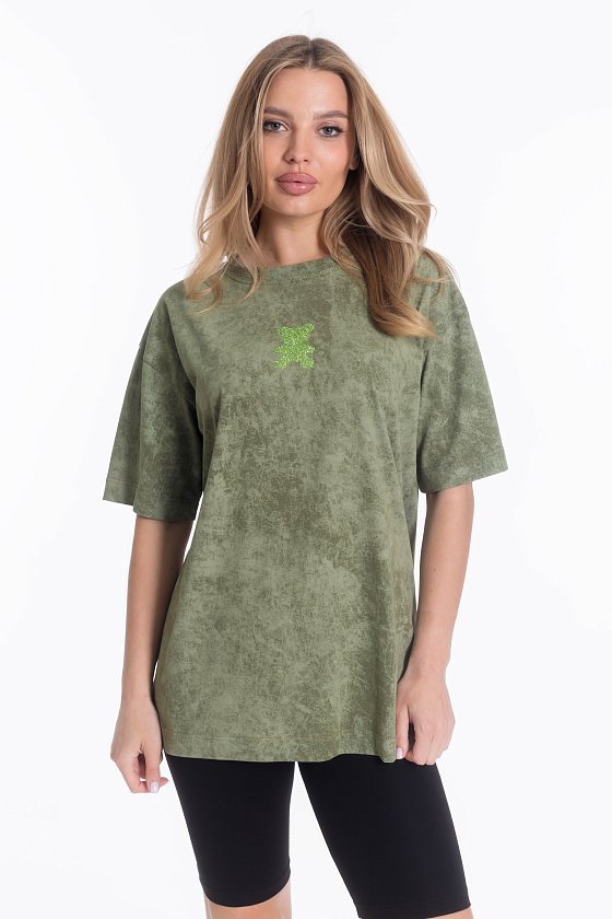 Женская футболка из лёгкой и приятной к телу ткани — отличный выбор для повседневного гардероба. Изготовлена из однотонной кулирки цвета хаки, имеет свободный силуэт и круглый вырез горловины. Принт на полочке добавляет изделию оригинальность. Футболка идеально подойдёт для отдыха или домашней носки.