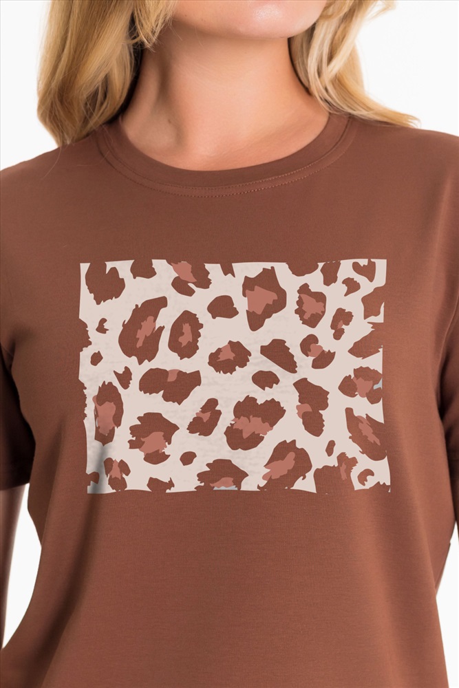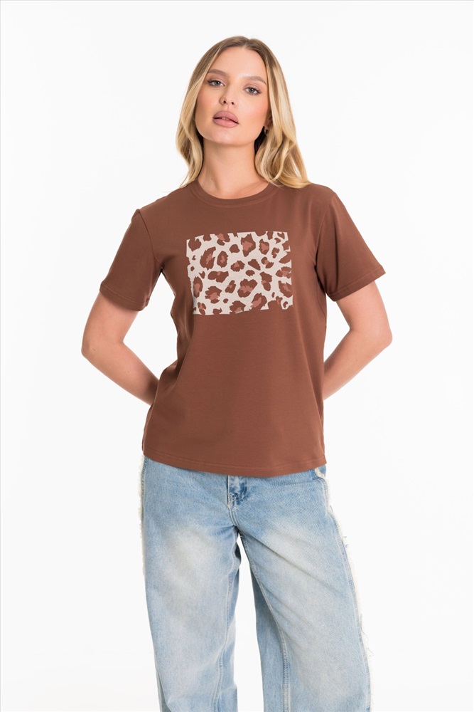 Цвет Номенклатуры: коричневый Женская футболка с принтом спереди изготовлена из хлопкового полотна с добавлением лайкры. Футболка с коротким втачным рукавом и круглым вырезом горловины, что придает ей классический стильный вид. Такая модель футболки отлично сочетается с джинсами, брюками или юбкой. Изготовленная из натуральной ткани, футболка обеспечит комфорт в течение всего дня.