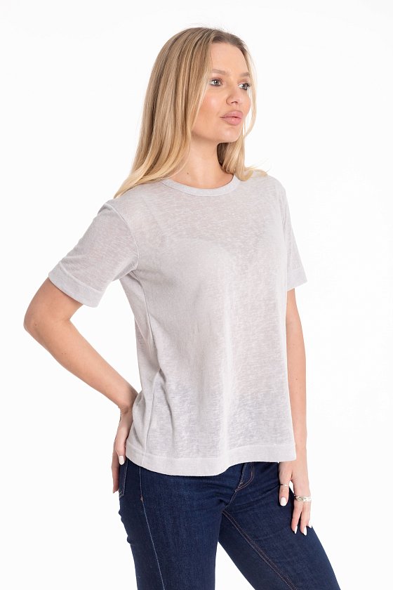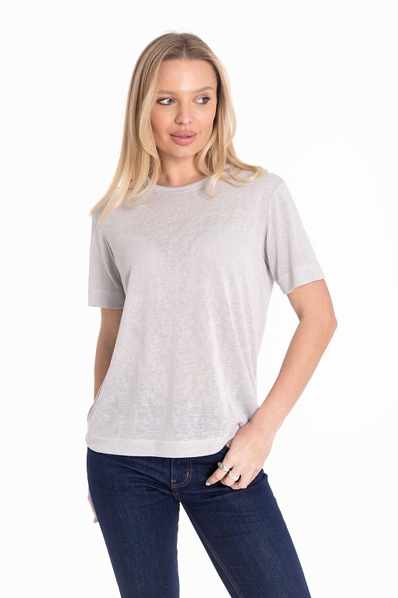 Женская футболка выполнена из поливискона. С коротким рукавом и круглым вырезом горловины, оформленным бейкой.