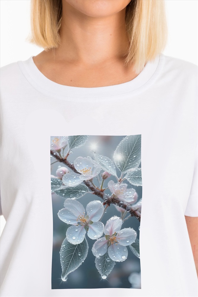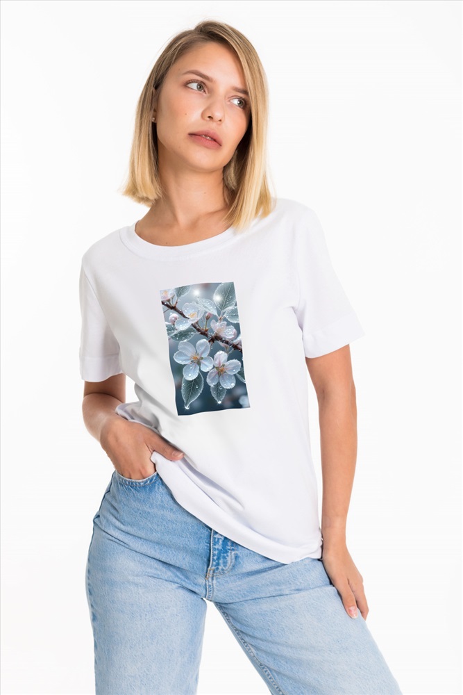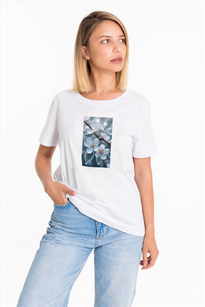 Женская футболка с принтом изготовлена из хлопкового полотна - что обеспечивает комфорт и хорошую воздухопроницаемость. Футболка имеет короткий рукав и круглый вырез горловины, что придает ей классический стильный вид. Такая модель футболки отлично сочетается с джинсами, брюками или юбкой. Изготовленная из натуральной ткани, футболка обеспечит комфорт в течение всего дня.