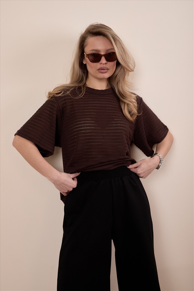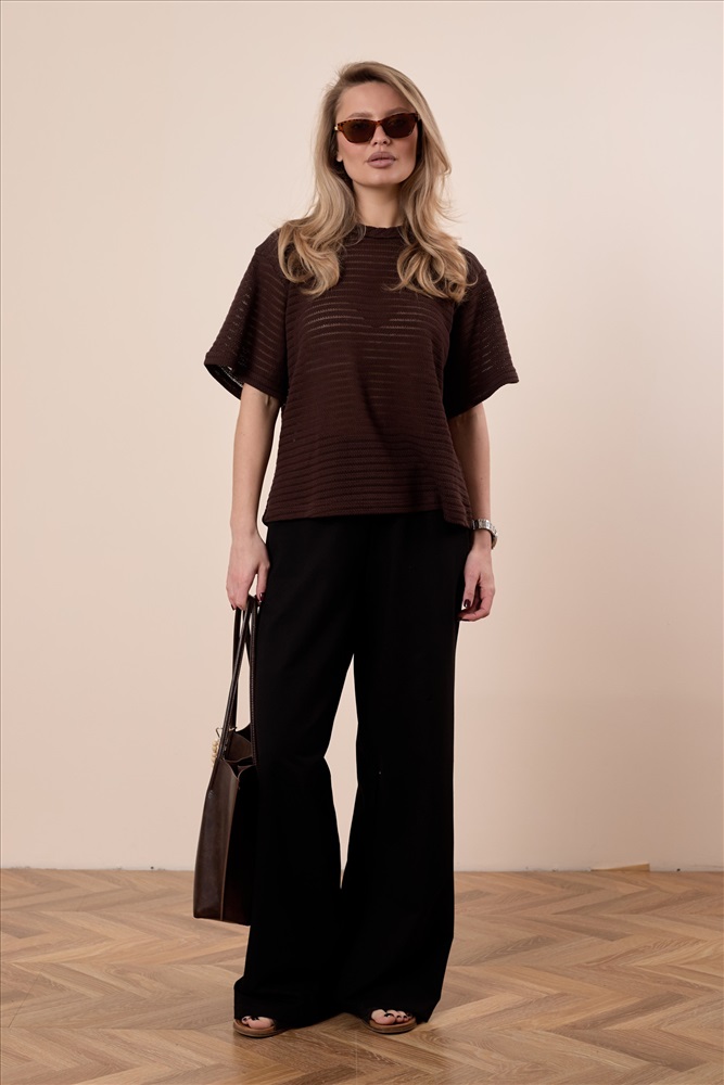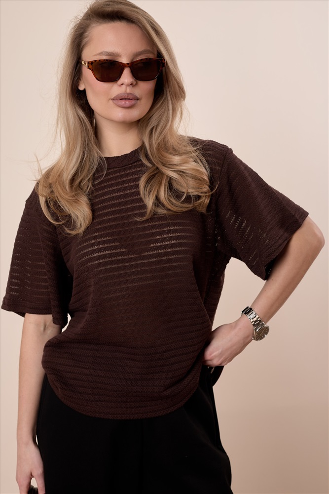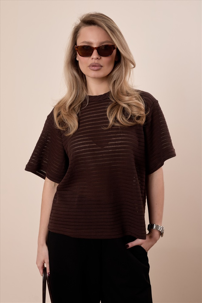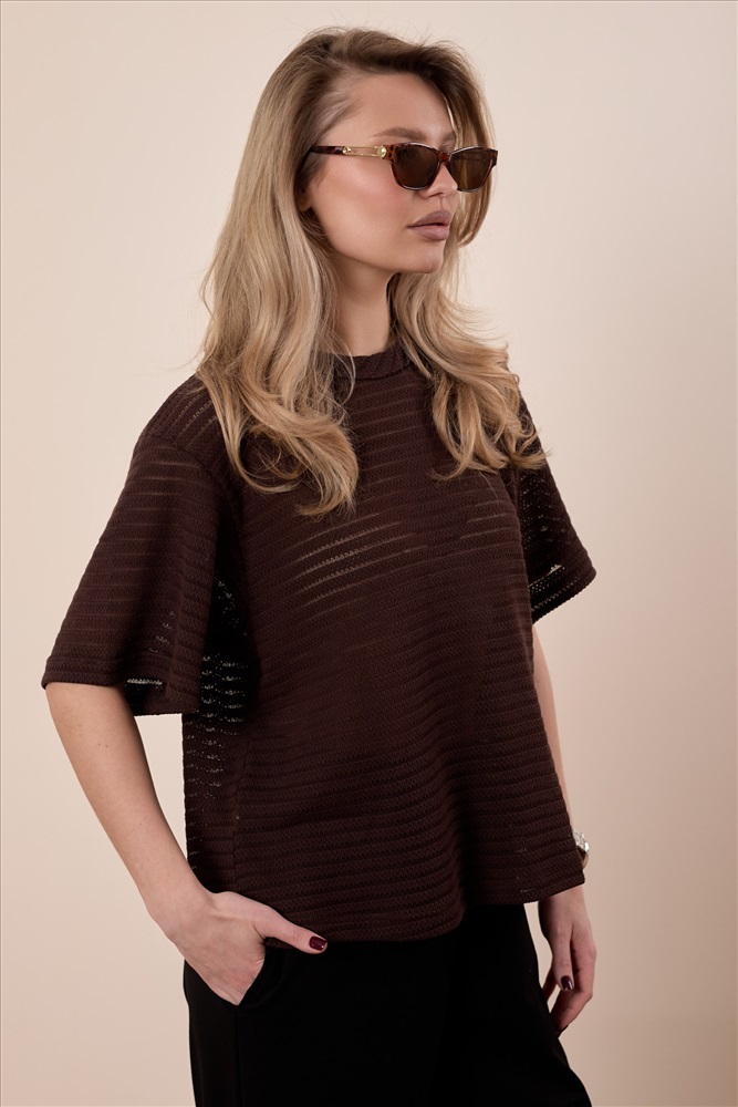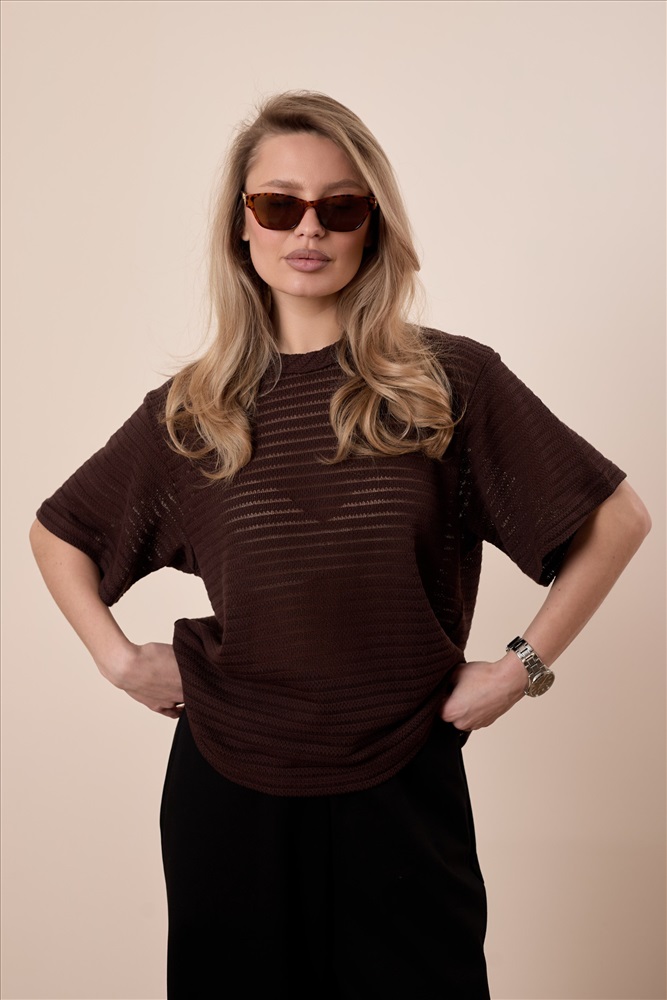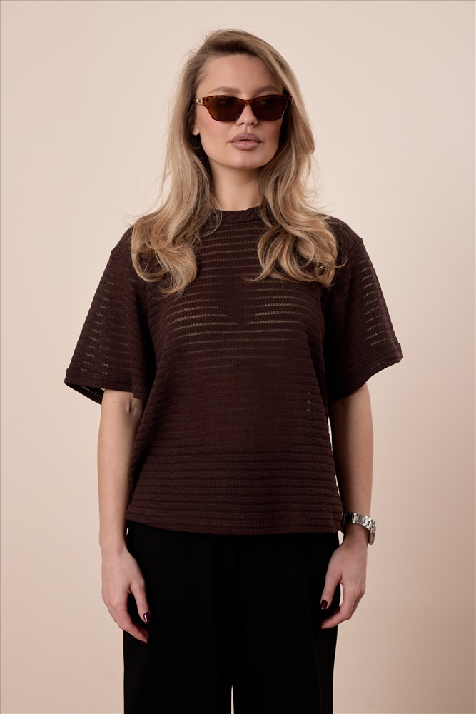 Сезон: Всесезонный Силуэт: Свободный Состав: Хлопок 78% Полиэстер 22% Цвет Номенклатуры: коричневый Футболка выполнена из лёгкого вязаного полотна, которое красиво ложится по фигуре и обеспечивает комфорт в носке. Свободный силуэт со спущенной линией плеча создаёт расслабленный и современный образ. Горловина аккуратно обработана бейкой, что придаёт модели завершённый вид. Отличный вариант для повседневных образов. Комментарии к товару