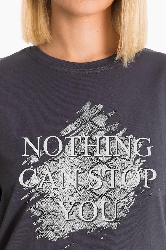 Женская футболка с принтом изготовлена из хлопкового полотна с добавлением лайкры, что обеспечивает комфорт и хорошую воздухопроницаемость. Футболка имеет короткий рукав и круглый вырез горловины, что придает ей классический стильный вид. Такая модель футболки отлично сочетается с джинсами, брюками или юбкой. Изготовленная из натуральной ткани, футболка обеспечит комфорт в течение всего дня.