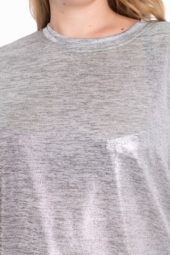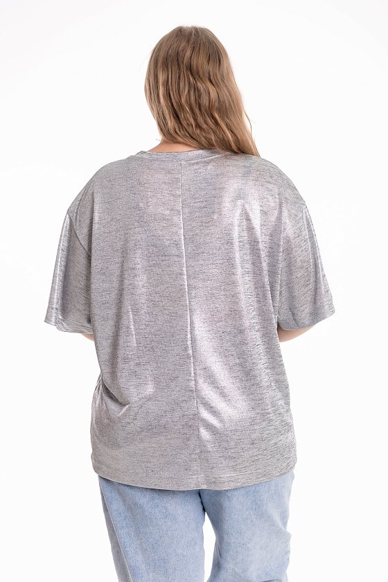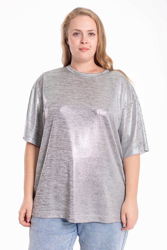 Футболка выполнена из вискозного полотна с эффектным напылением «серебро». Лёгкий блеск придаёт изделию современный и стильный вид. Свободный крой и спущенная линия плеч обеспечивают комфорт и свободу движений. Классический круглый вырез горловины делает модель универсальной — её можно сочетать как с джинсами, так и с юбками или брюками. Такая футболка станет ярким акцентом в повседневном или праздничном образе.
