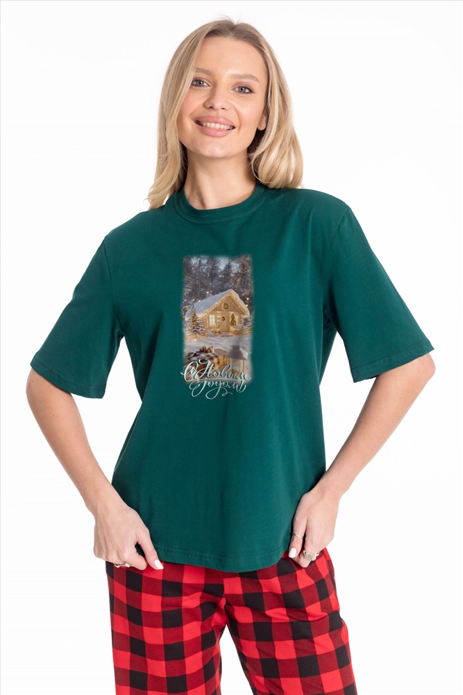 Сезон: Всесезонный Силуэт: Прямой Состав: Хлопок 100% Цвет Номенклатуры: зеленый Футболка с новогодним принтом выполнена из хлопкового полотна. Материал приятен к телу, создает комфорт и хорошую воздухопроницаемость. Классический крой с коротким рукавом и круглым вырезом горловины обеспечивает удобную посадку и свободу движений. Отличный выбор для создания праздничного настроения и комфортных повседневных образов. Комментарии к товару