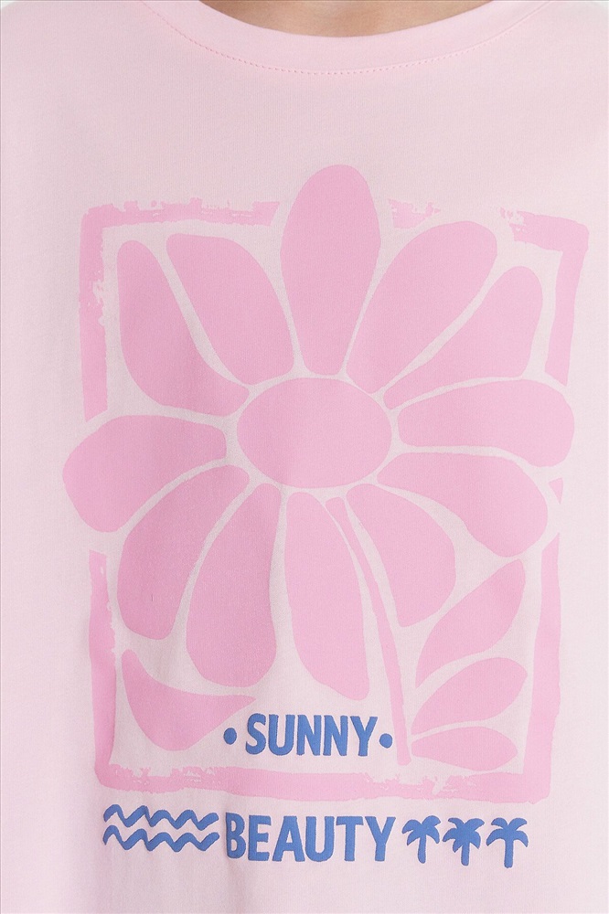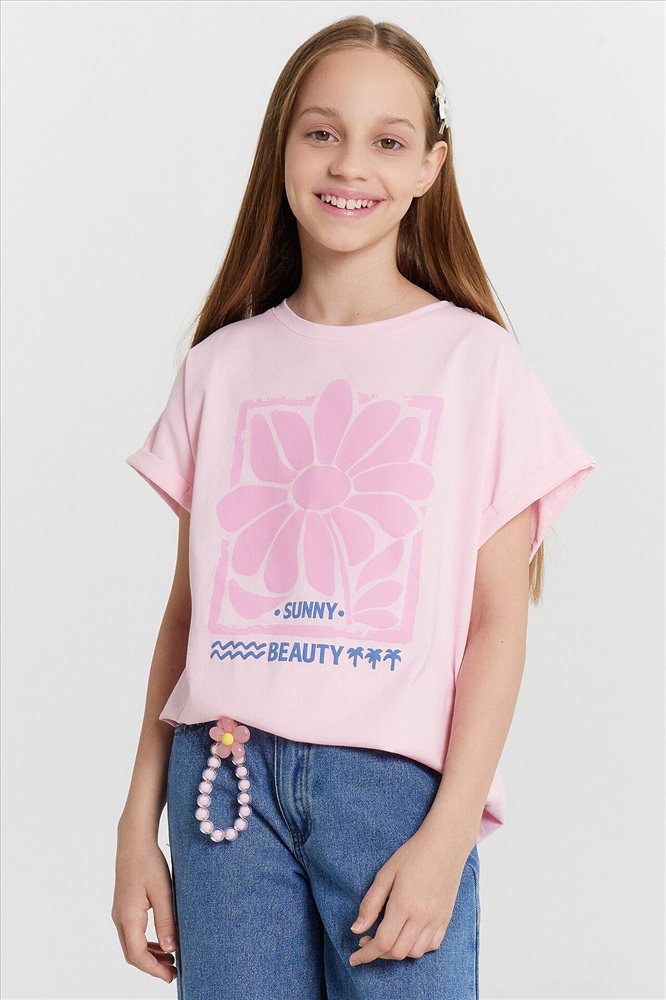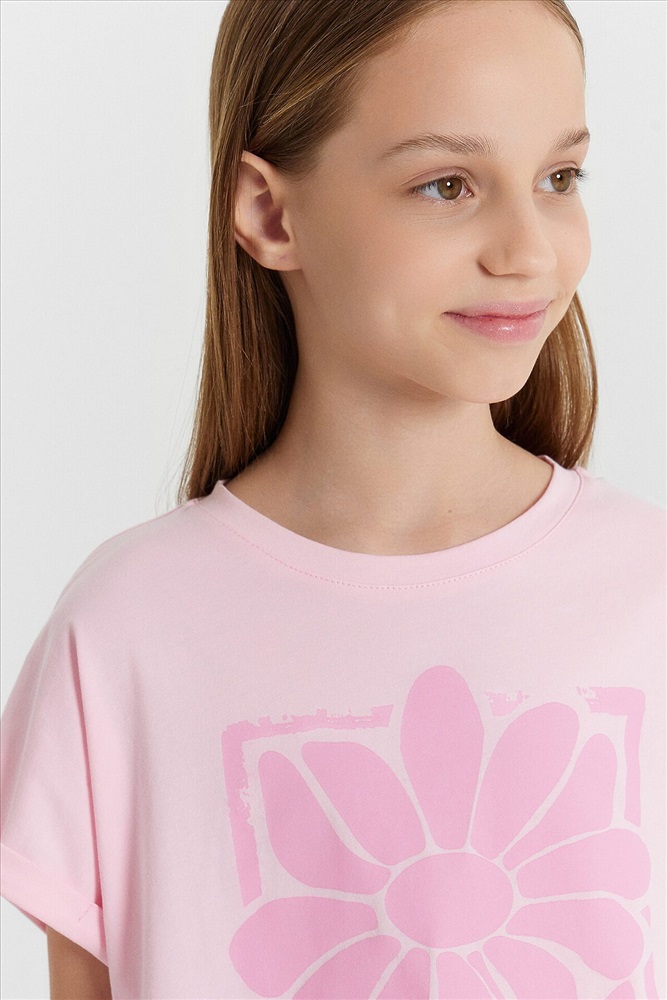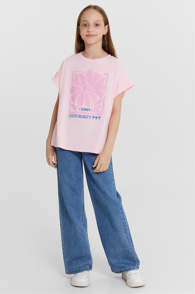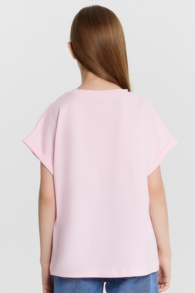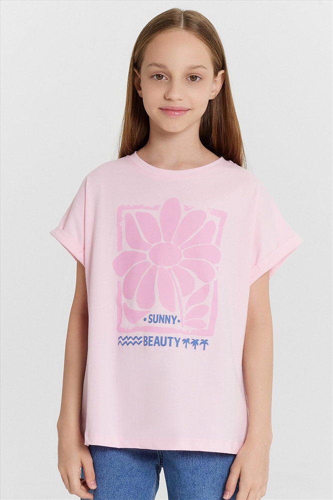 Футболка прямого силуэта для девочек с цельнокроеным рукавом. Нижние срезы рукавов с отворотами. Горловина круглой формы, обтачка из основного полотна. Шов притачивания обтачки закрыт бейкой из основного полотна. Низ изделия обработан на 2-х игольной плоскошовной машине швом в подгибку.
