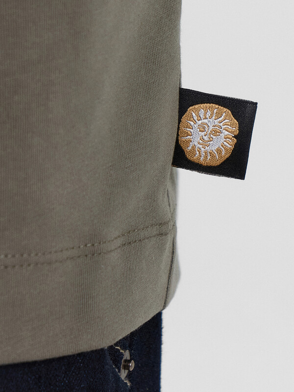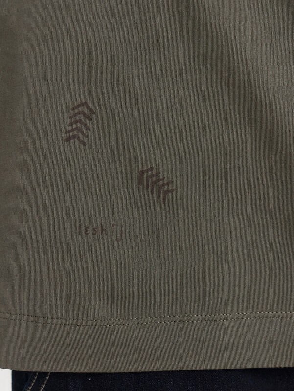 Горловина округлой формы обработана обтачкой из рибаны. Шов втачивания обтачки по спинке закрыт бейкой из основного полотна. Плечо слегка спущено. Рукава втачные короткие.