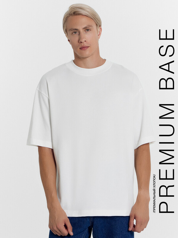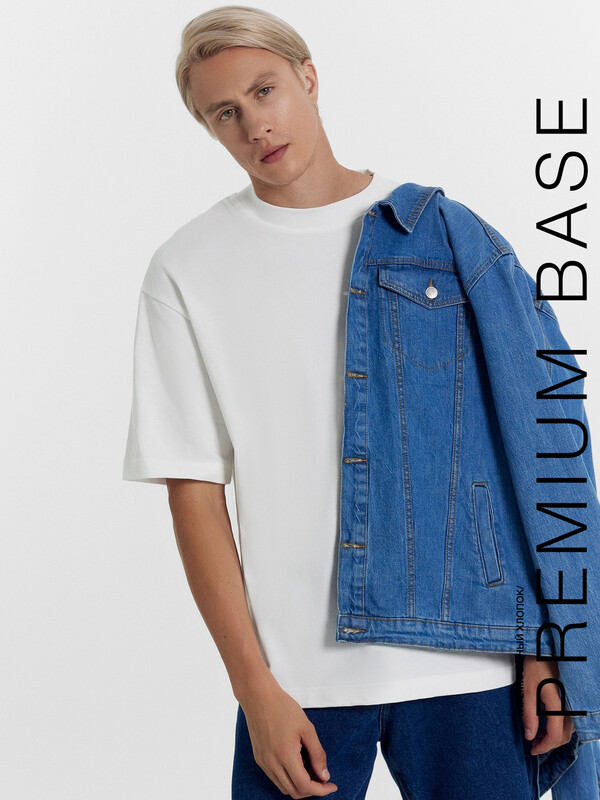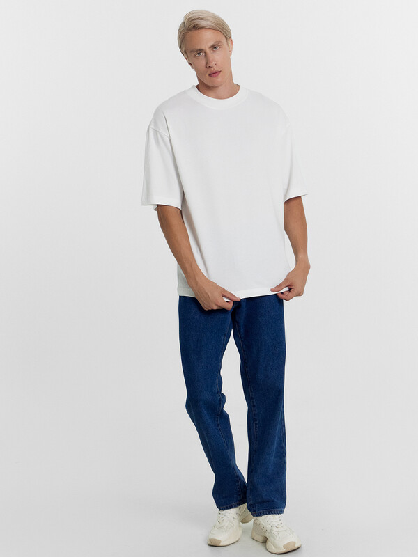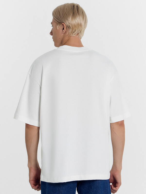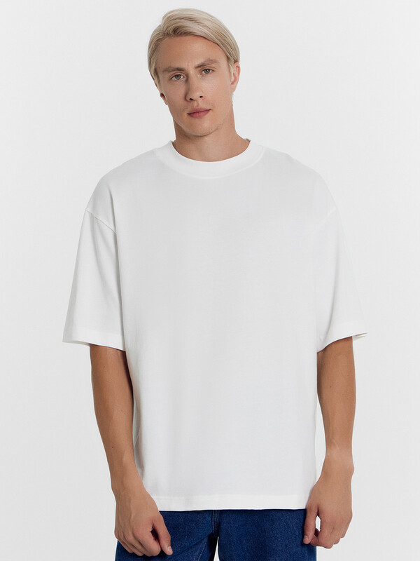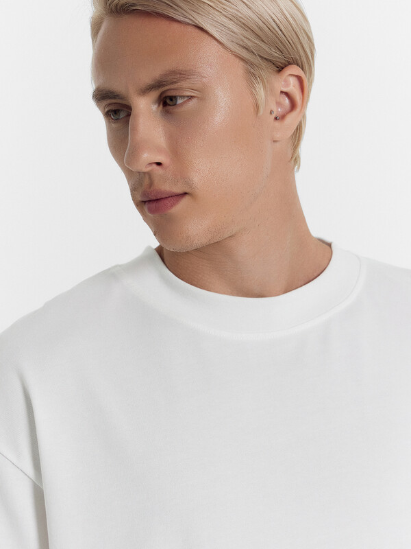 Футболка свободная, оверсайз.Горловина округлой формы обработана обтачкой из рибаны. Шов втачивания обтачки по спинке закрыт тесьмой хб.