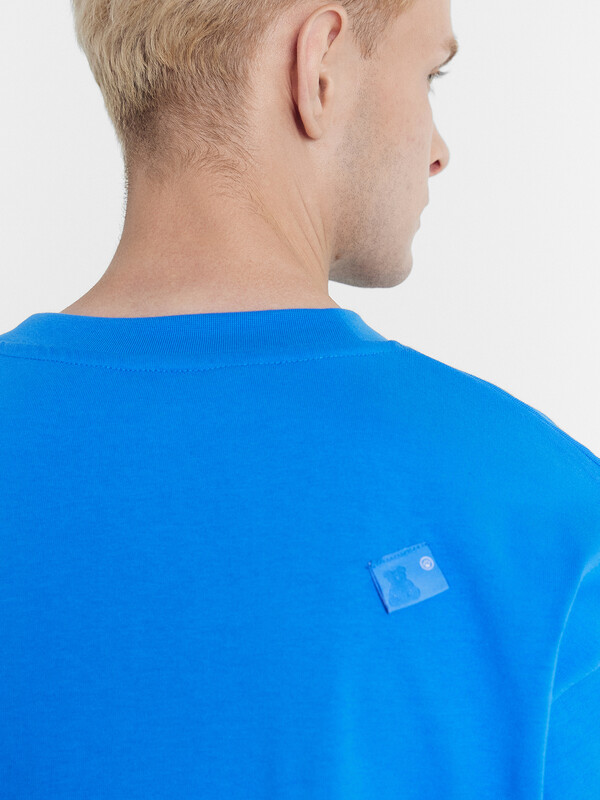 Нижние срезы футболки и рукавов обработаны швом вподгибку.