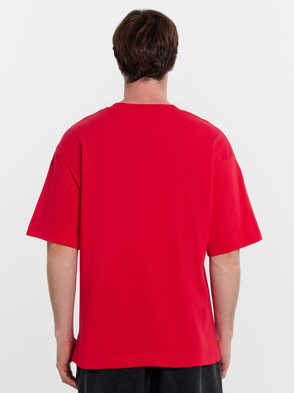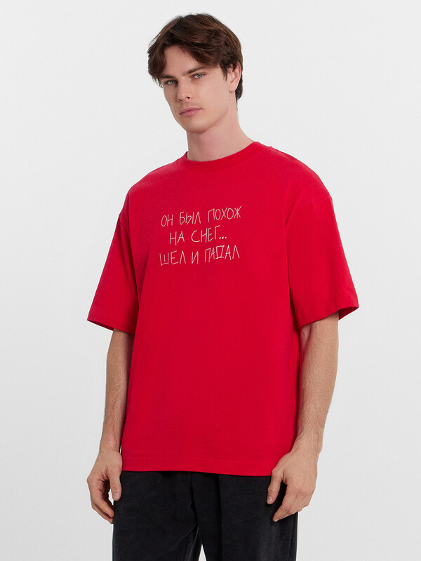 Футболка свободная, оверсайз.Горловина округлой формы обработана обтачкой из рибаны. Шов втачивания обтачки по спинке закрыт тесьмой хб.