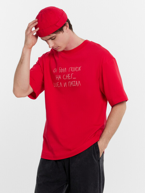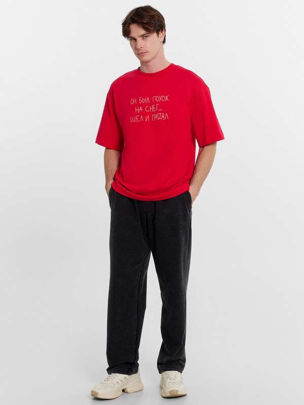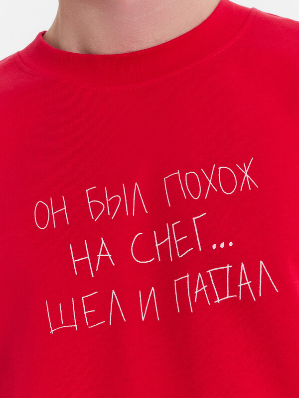 Нижние срезы футболки и рукавов обработаны швом вподгибку.