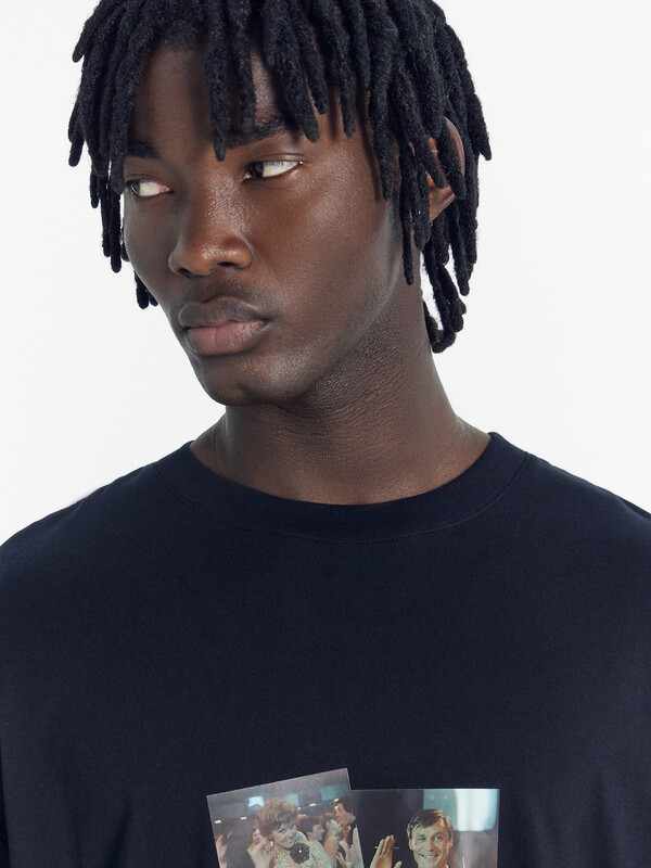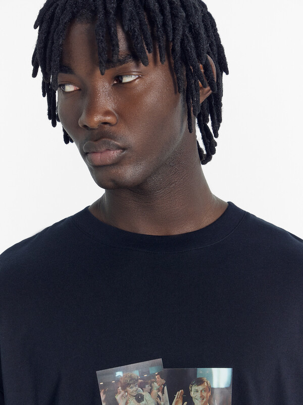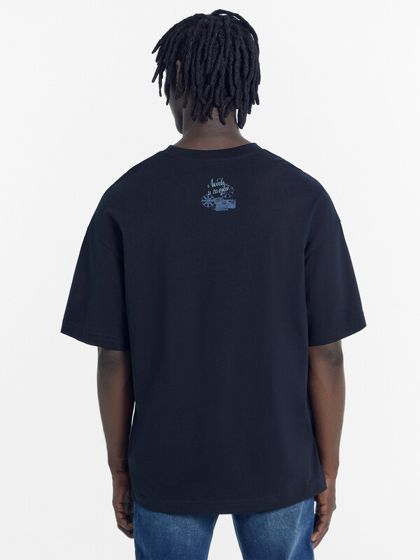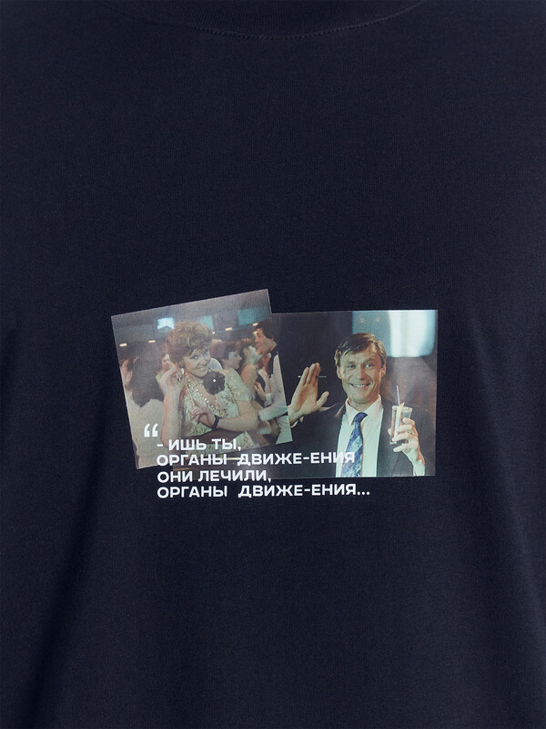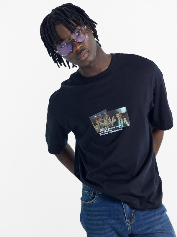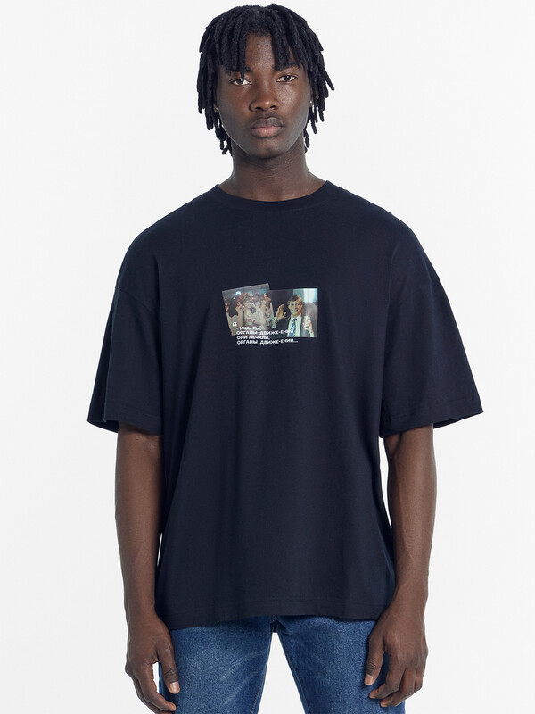 Футболка прямая, свободная. Горловина округлой формы обработана обтачкой из рибаны. Шов втачивания обтачки по спинке закрыт бейкой из основного полотна. Рукава втачные, корткие. Линия плеча спущена. Нижние срезы футболки и рукавов обработаны швом вподгибку.