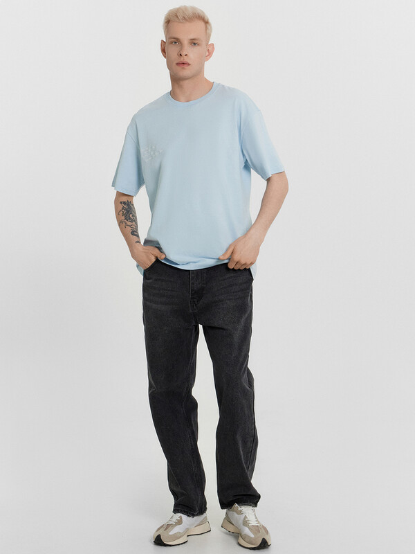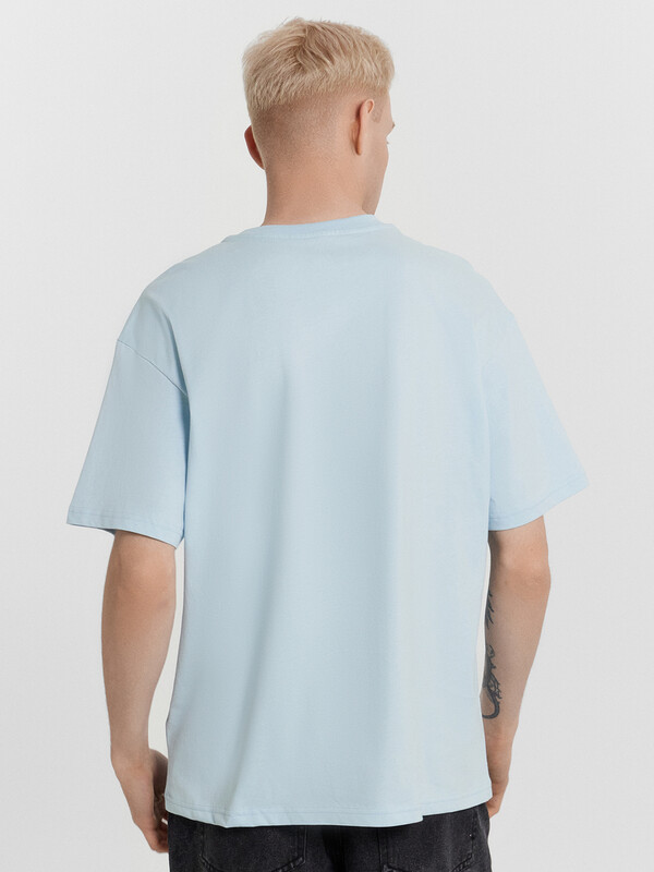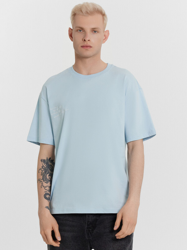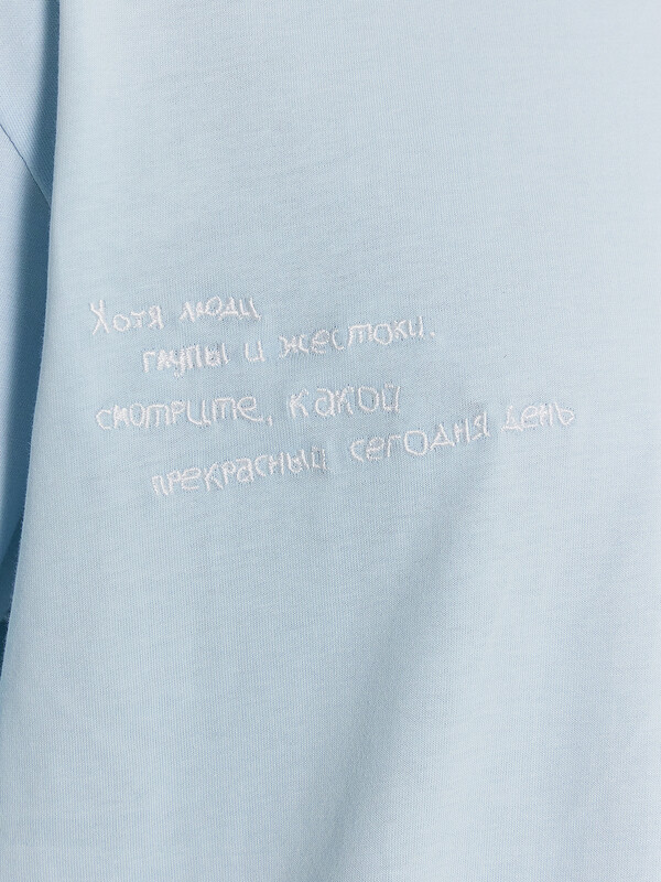Футболка свободного силуэта. Перед и спинка цельнокроеные. Горловина круглой формы. Обтачка горловины из рибаны 1*1. По горловине проложена отделочная строчка. Горловина спинки закрыта тесьмой из основного полотна. Плечо спущено, пройма углублена. Рукав втачной, длина рукава чуть выше локтя.