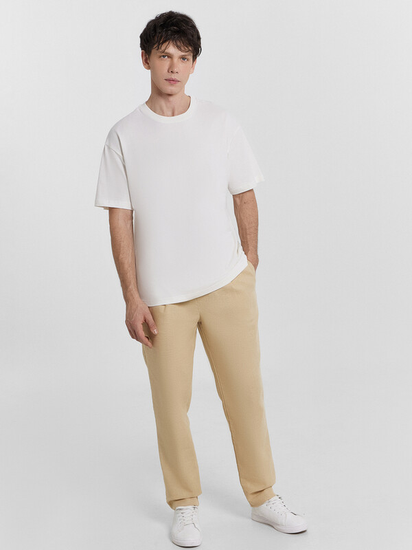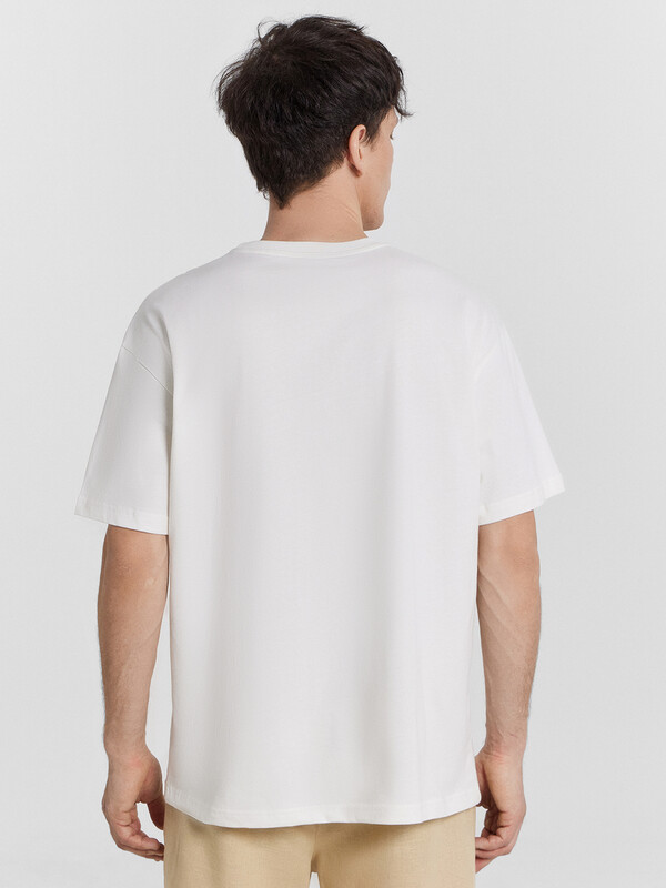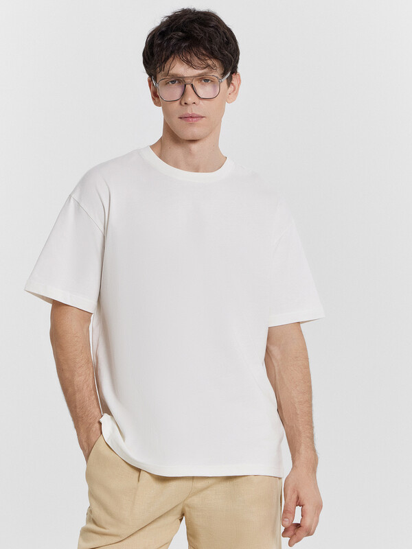 Производитель: Mark Formelle Футболка свободного силуэта. Перед и спинка цельнокроеные. Горловина круглой формы. Обтачка горловины из рибаны 1*1. По горловине проложена отделочная строчка. Горловина спинки закрыта тесьмой из основного полотна. Плечо спущено, пройма углублена. Рукав втачной, длина рукава чуть выше локтя.