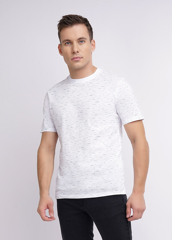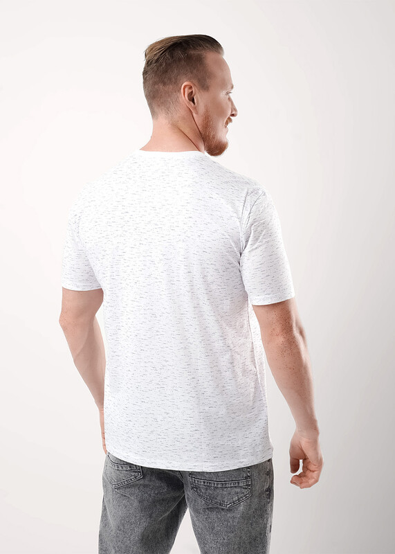Фуфайка с коротким рукавом среднего объема, круглым вырезом горловины, которая оформлена обтачкой из рибаны, выполненная из набивного полотна.