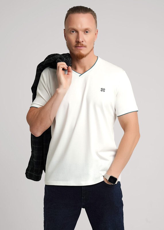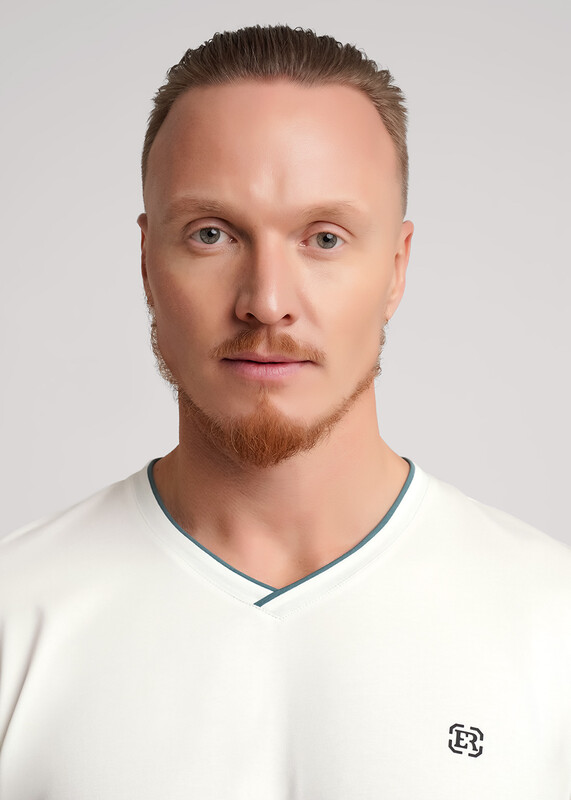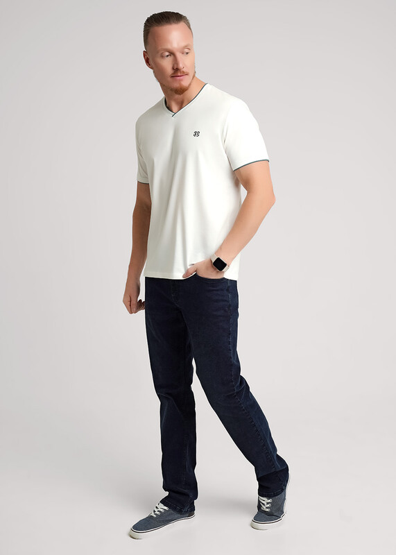 Мужская футболка из трикотажного полотна. Изделие с V-образным вырезом горловины и коротким втачным рукавом. Футболка отличается за счет контрастных вставок по горловине и манжету, фирменным принтом.