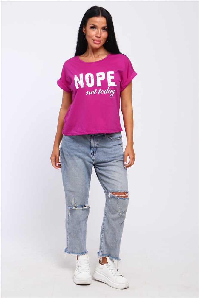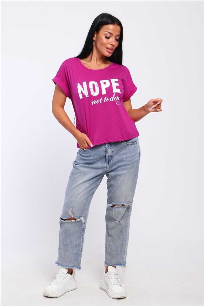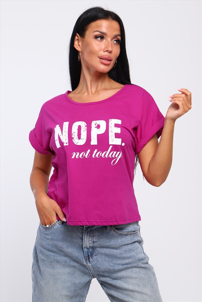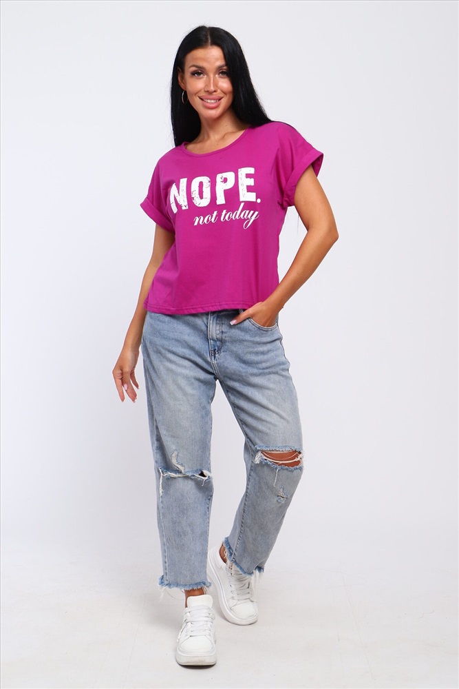 Футболка женская укороченная со спущенным плечом, округлым вырезом горловины и широкими рукавами с подворотами. Свободный крой и оригинальная надпись Nope делает ее актуальной в любом сезоне лето, осень. Современный дизайн и оригинальный крой подойдет для девушек подростков и более взрослой аудитории. Состоит из 100% хлопка (кулирка).