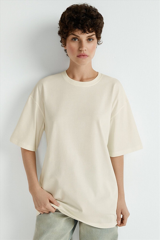 Женская футболка OVERSIZE свободного кроя с удлиненной линией плеча и коротким рукавом. Круглая горловина выполнена из трикотажного материала рибана в стиле «английская резинка». Длина изделия чуть ниже линии бедер. Футболка изготовлена из мягкого хлопка, который обладает высокой воздухопроницаемостью, приятно ощущается на теле и подходит даже для чувствительной и нежной кожи. Низ изделия и рукава аккуратно обработаны с использованием плоскошовной технологии, что обеспечивает дополнительный комфорт. Минималистичная базовая футболка - идеальный фон для самобытных образов и универсальный элемент в повседневном гардеробе.
