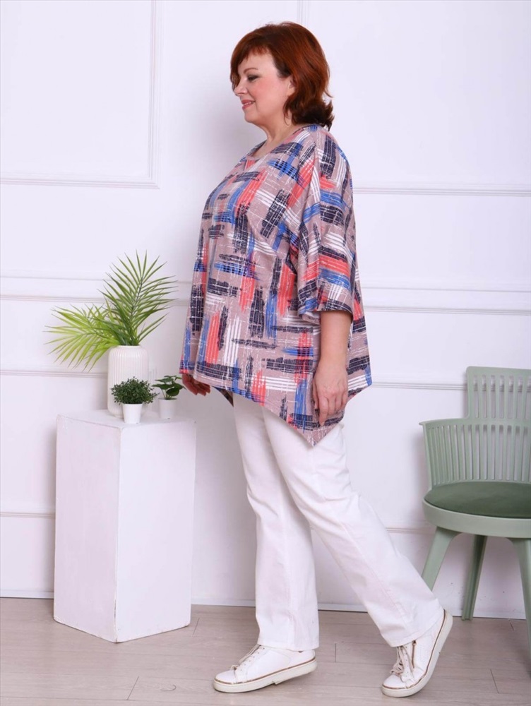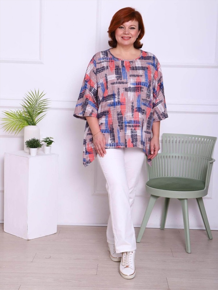 Женская футболка выполнена из полотна "кулирка". Футболка свободного кроя с рукавом "летучая мышь" длиною 3/4. Горловина круглой формы обработана бейкой, низ футболки разноуровневый. Комментарии к товару