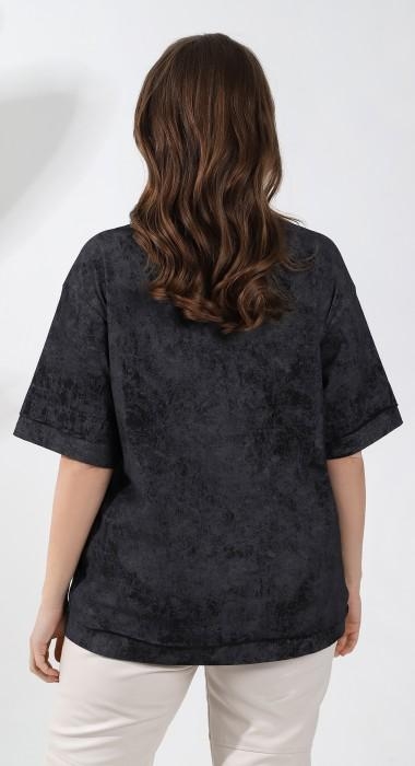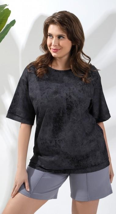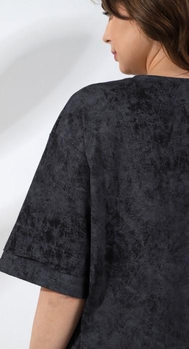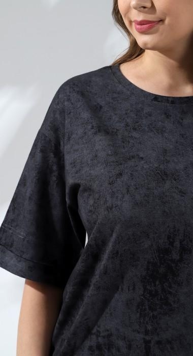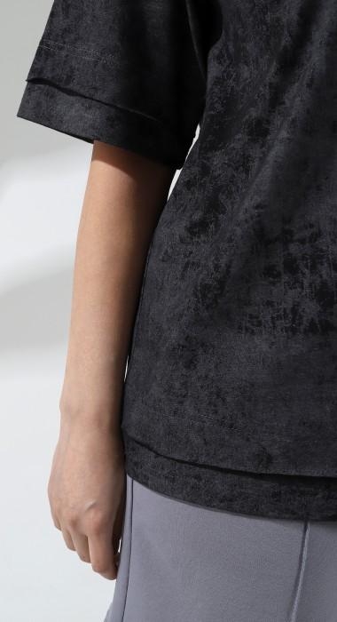 Футболка из гладкокрашеного трикотажного полотна «кулирка» с эффектом «варенки», свободного покроя, горловиной овальной формы, обработанной притачной планкой. Низ рукавов и изделия состоит из двух частей, одна из которых с необработанным краем, другая с подгибкой и соединенных между собой накладным швом.