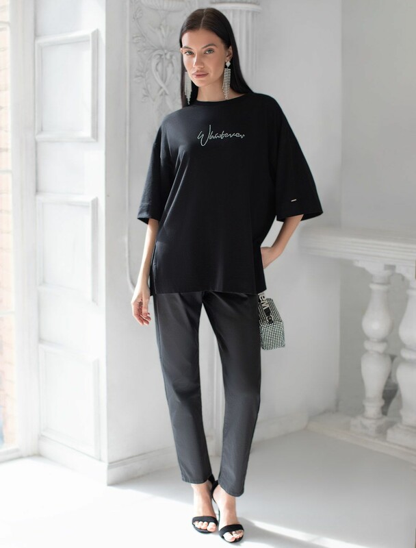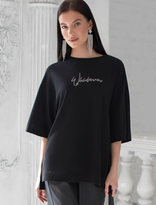 Производитель: Vilatte Оверсайз футболка черного цвета из премиального хлопка с добавлением эластана создана для комфорта и стиля каждый день. Натуральный материал приятный к телу, дышащая ткань хорошо держит форму и подходит для повседневной носки дома, в офисе или на прогулке. Классический свободный крой, удлиненный прямой силуэт и свободная посадка делают эту базовую футболку универсальным решением для любой фигуры и роста, включая плюс сайз размеры и беременных девушек, отлично скроет животик. Широкие рукава держат форму и подойдут на полные руки. Нарядная футболка украшена авторским принтом пайетками. Такой акцент делает модель уместной как для особых случаев, так и для ежедневных образов.