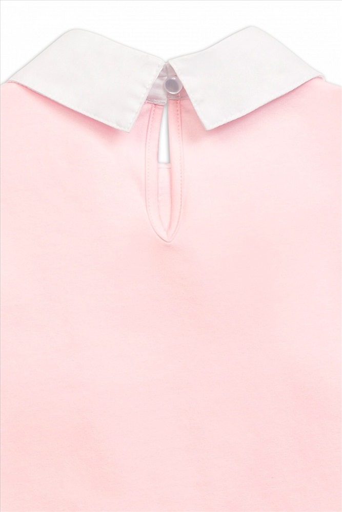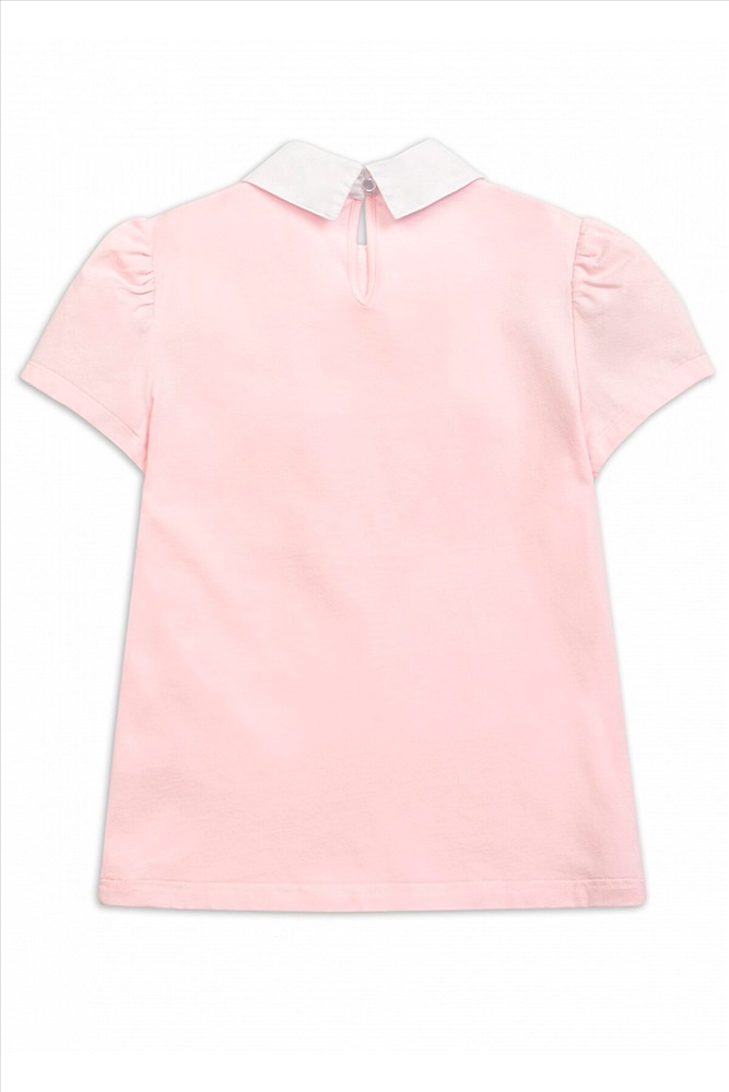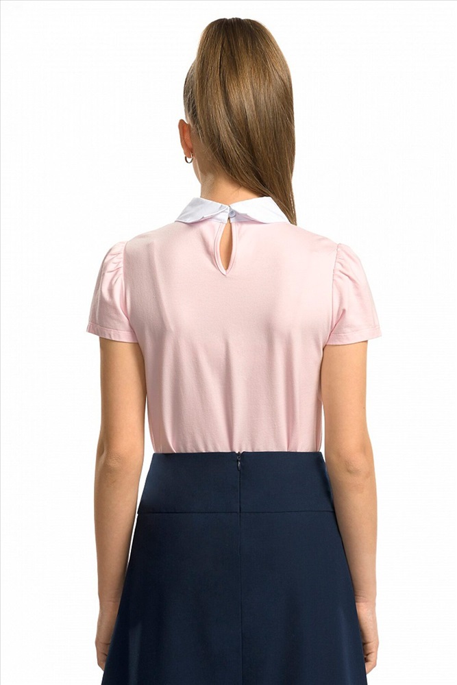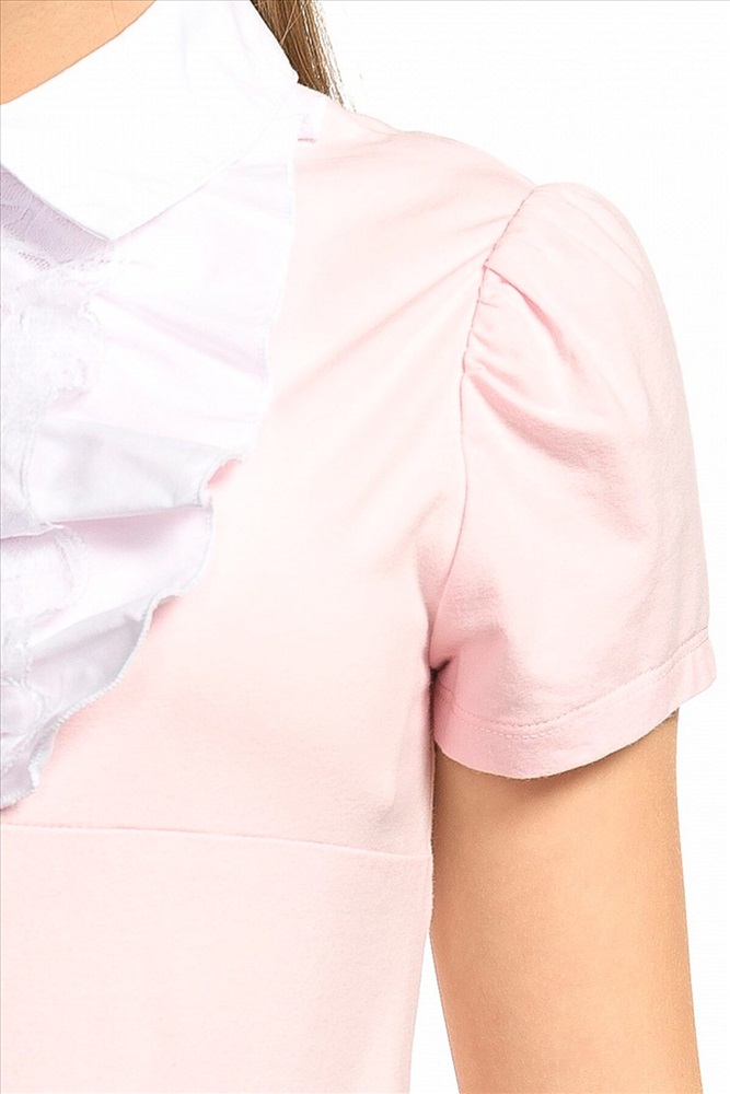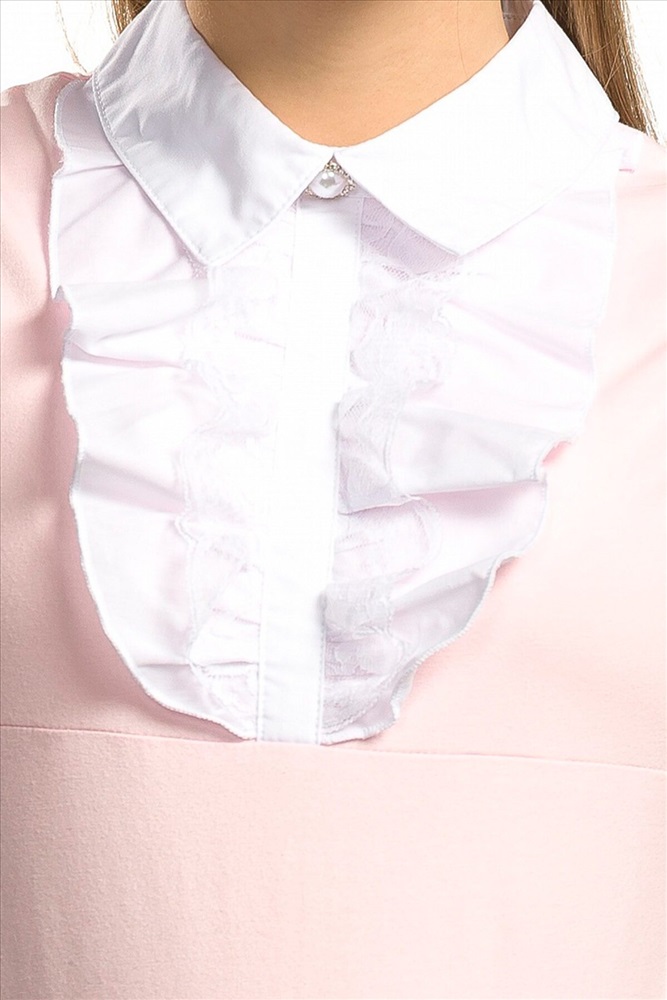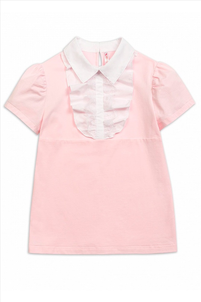 Страна производства: Китай Футболка для девочек полуприлегающего силуэта с воротником из швейной ткани на отрезной стойке, имитирующим воротник рубашки. Перед украшает жабо из швейной ткани и кружева, собранное под вертикальную планку. Декор в виде брошки с жемчужиной и стразами. По спинке застежка на одну пуговицу. Рукав с небольшой сборкой по окату.